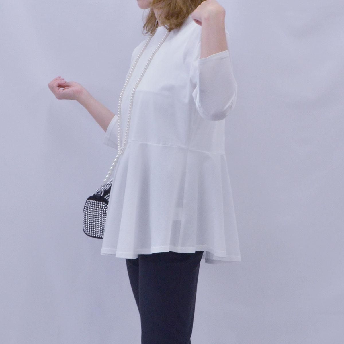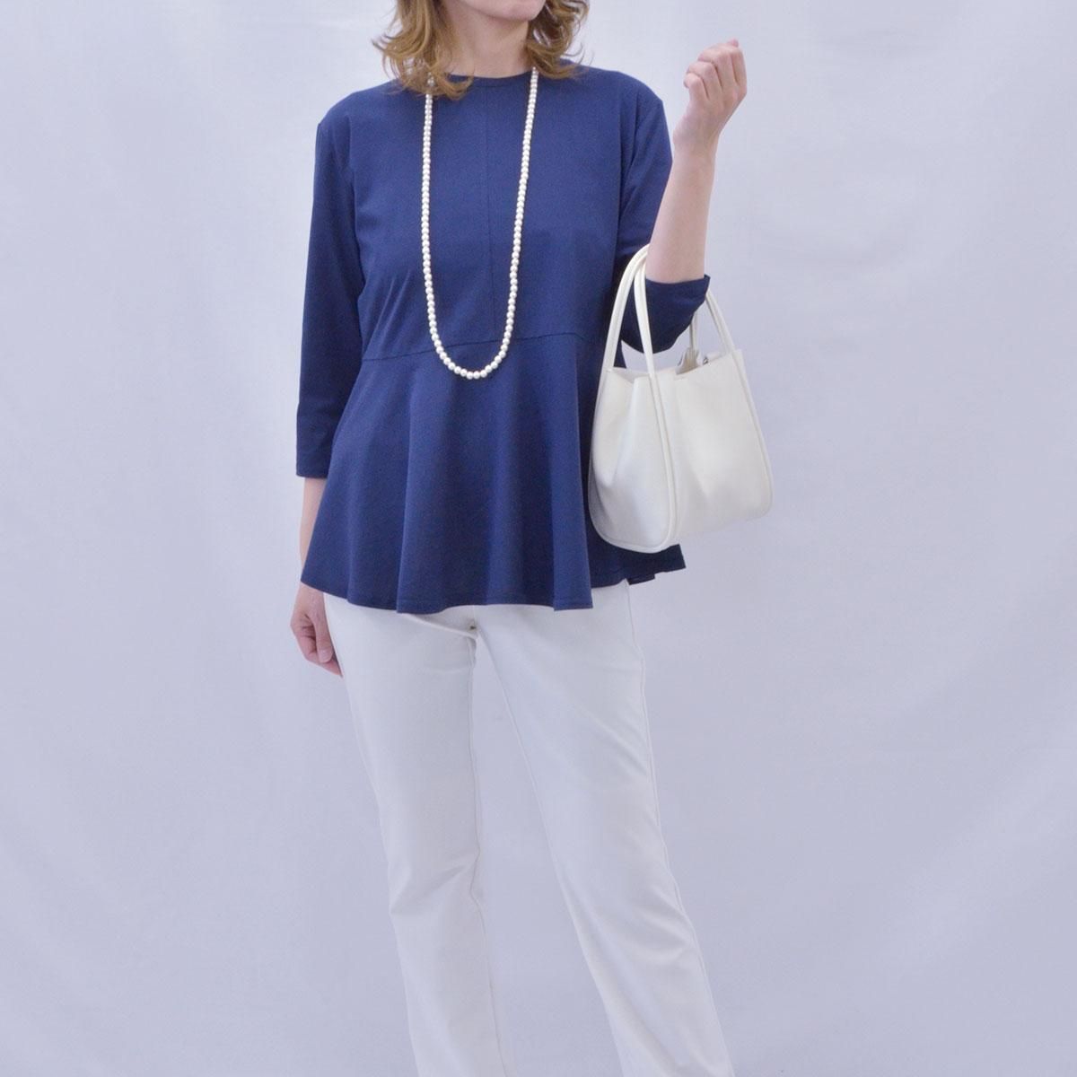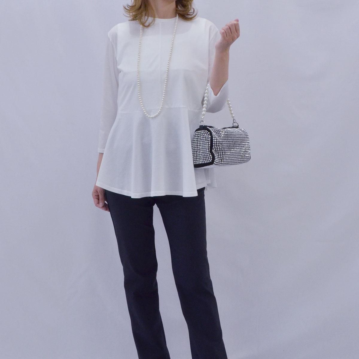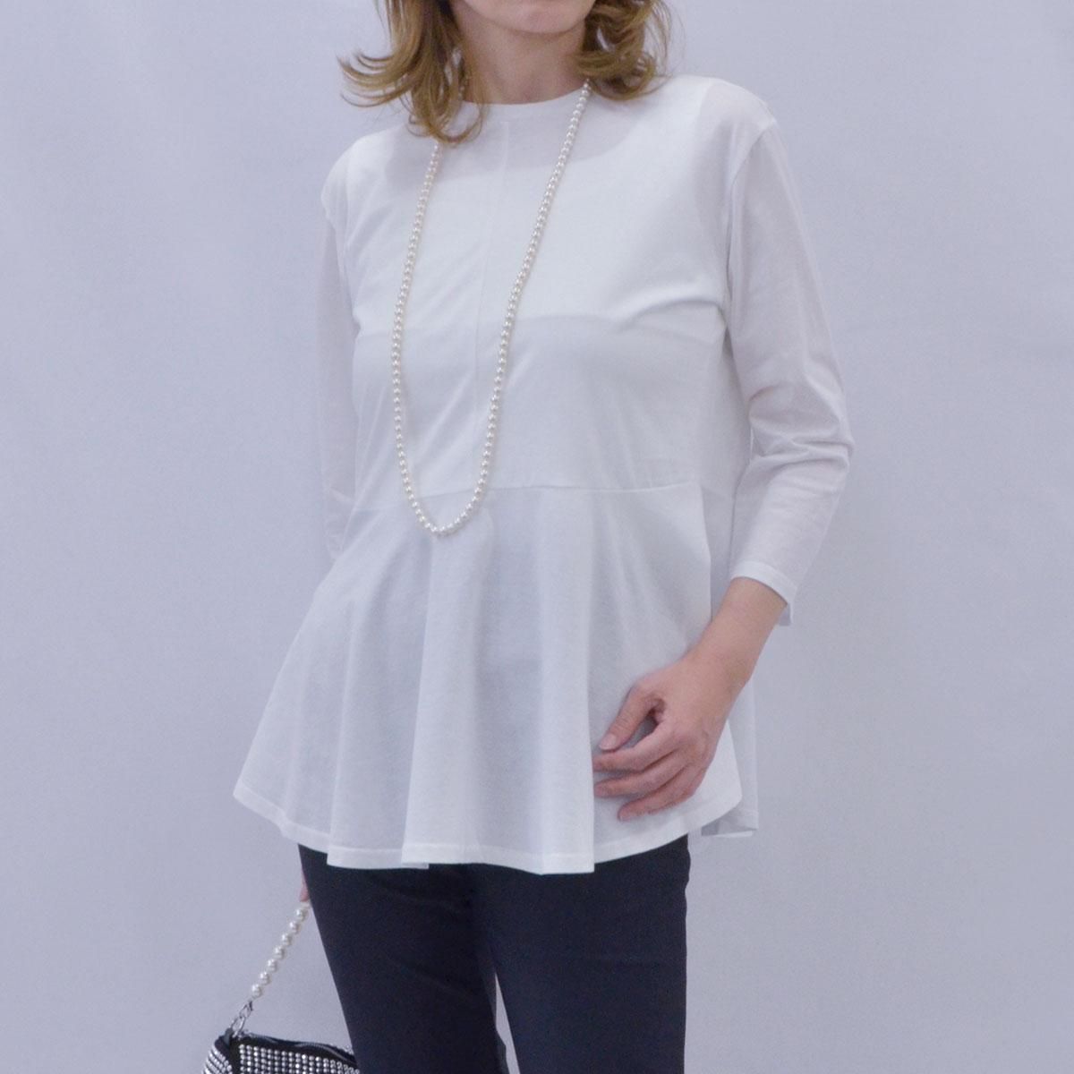 女性らしい魅力を引き立てるペプラムデザインが特徴の八分袖カットソー。