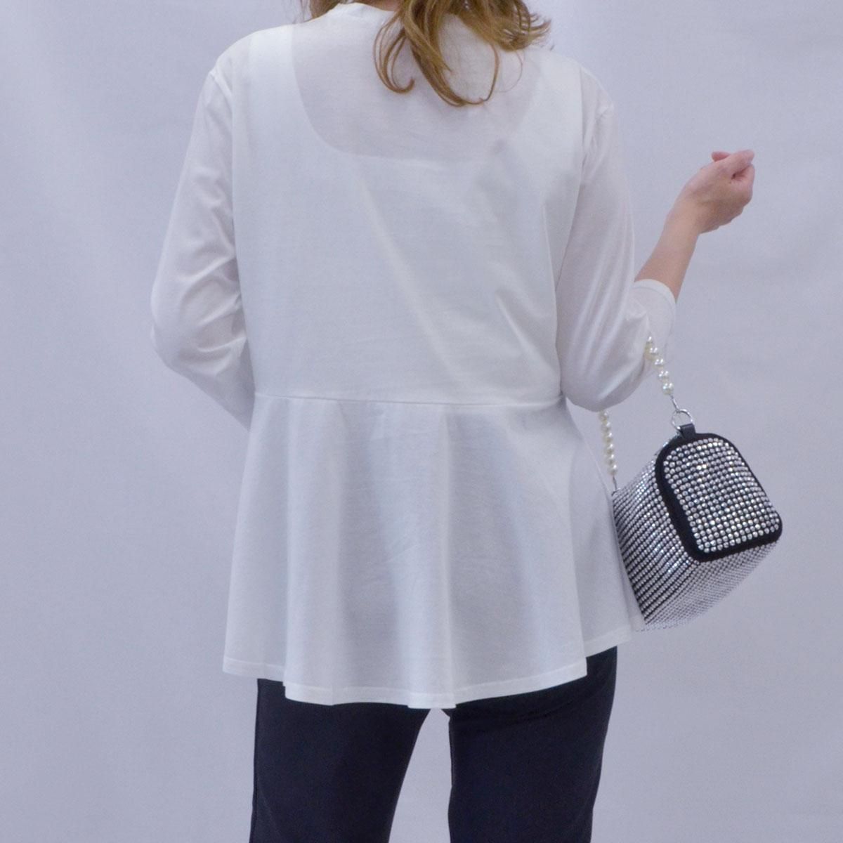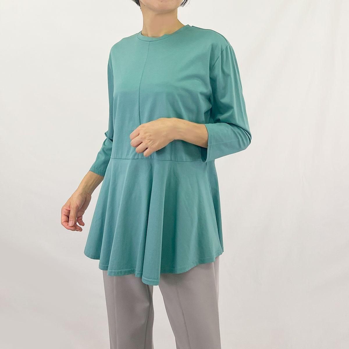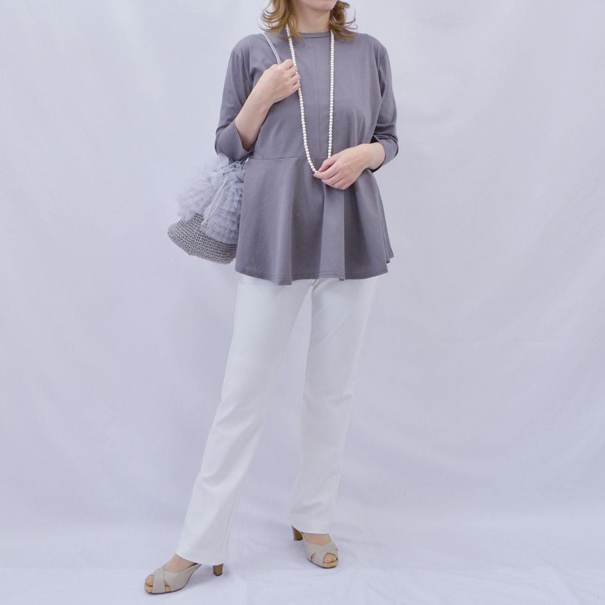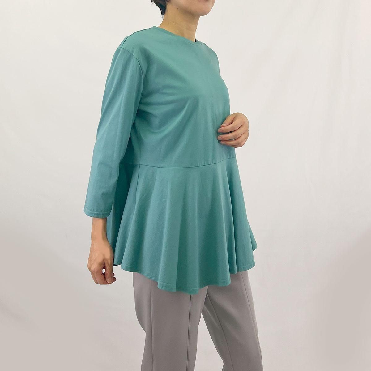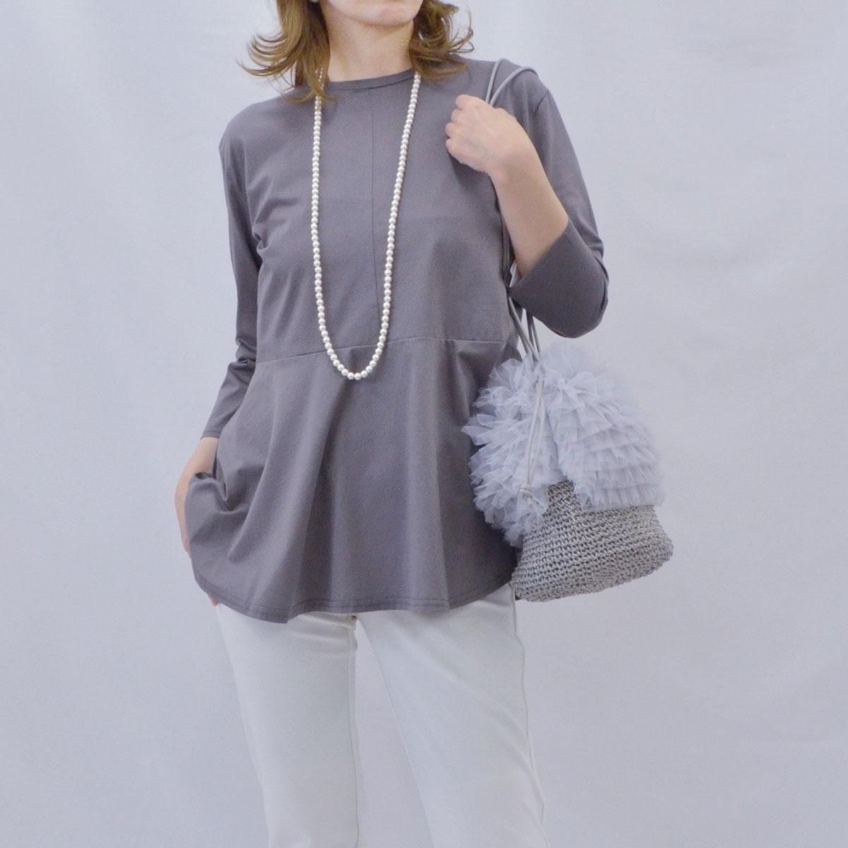 女性らしい魅力を引き立てるペプラムデザインが特徴の八分袖カットソー。
