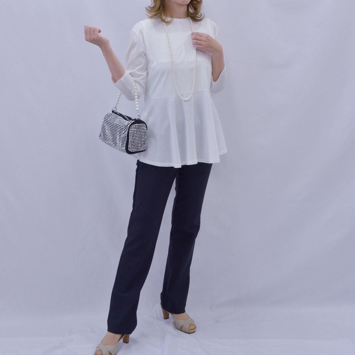 ウエストの切り替えから裾にかけて広がるぺプラムシルエットが、女性らしい印象を演出します。