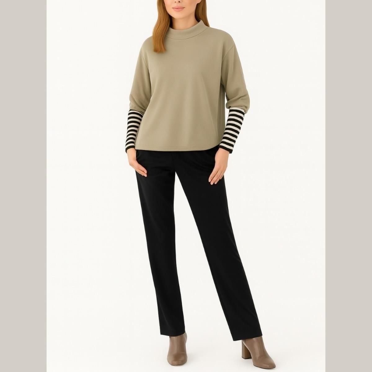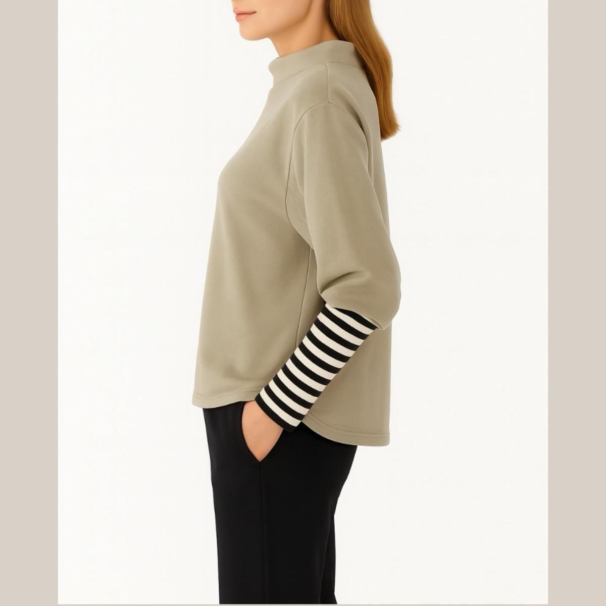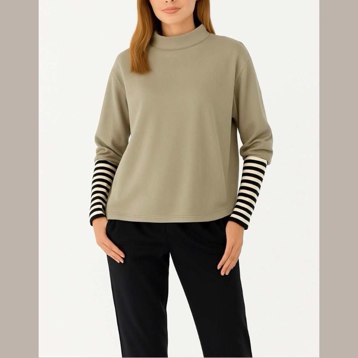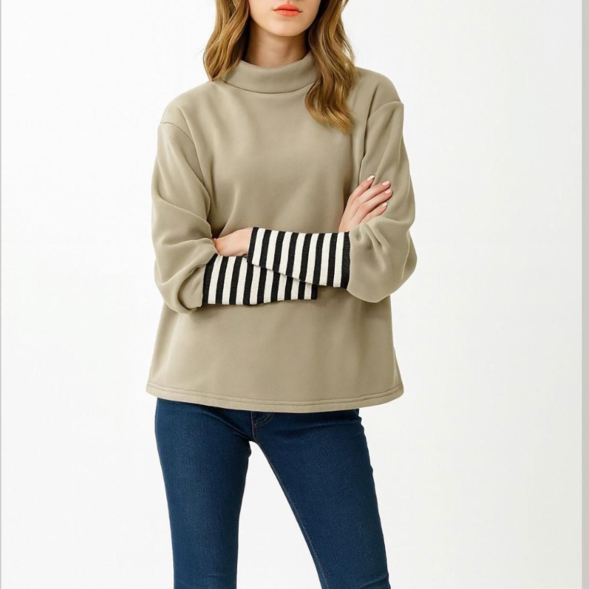 ちびハイネック・袖ボーダー・異素材切替・裏起毛プルオーバー