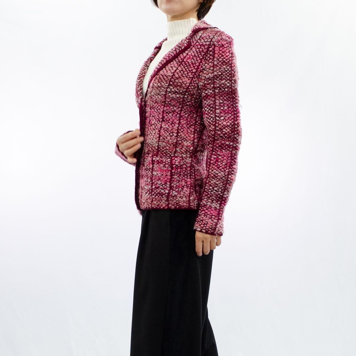 落ち着きのあるピンクからバーガンディー系のグラデーションが大人の女性らしさを引きたて、羽織るだけで主役になる一着です。