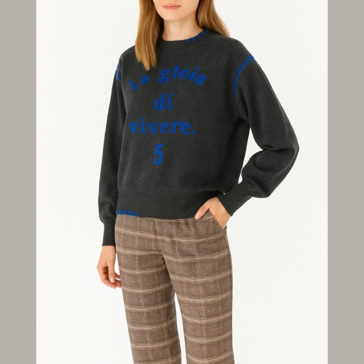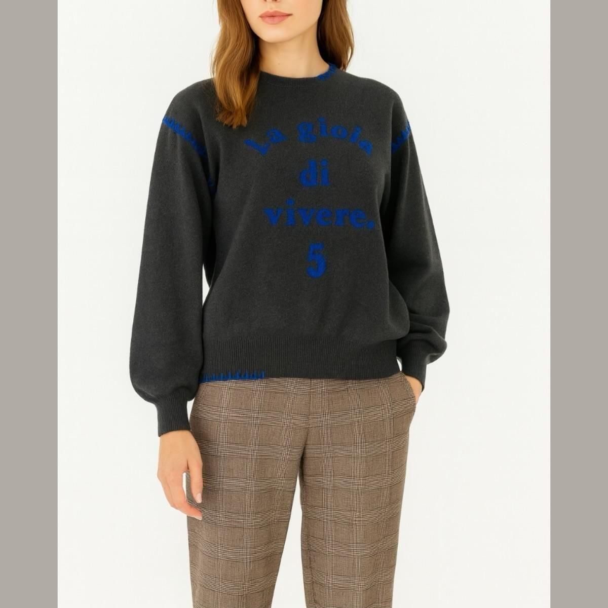袖はボリュームを持たせ、袖口と裾はリブ編みで仕上げることで、メリハリのあるシルエットに。