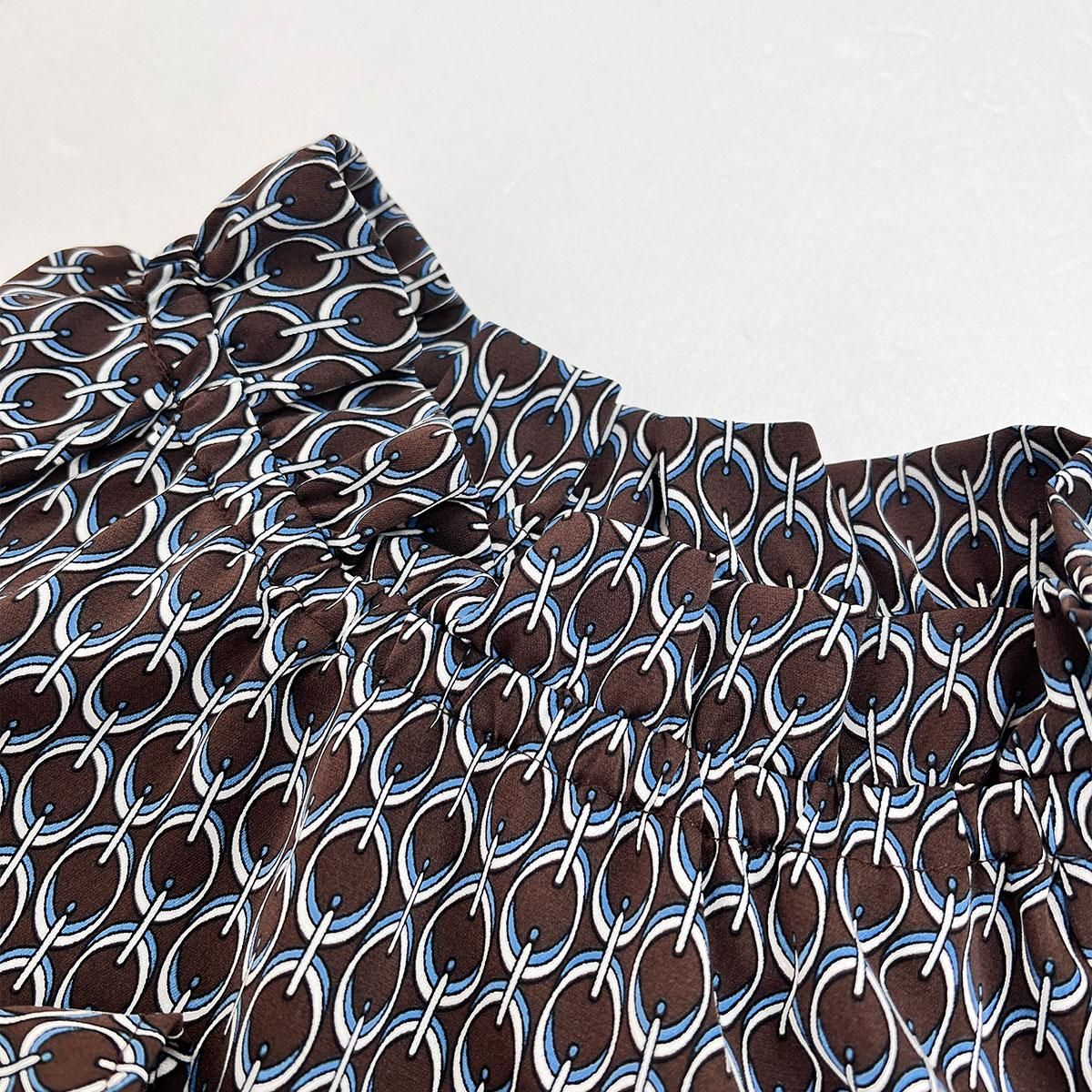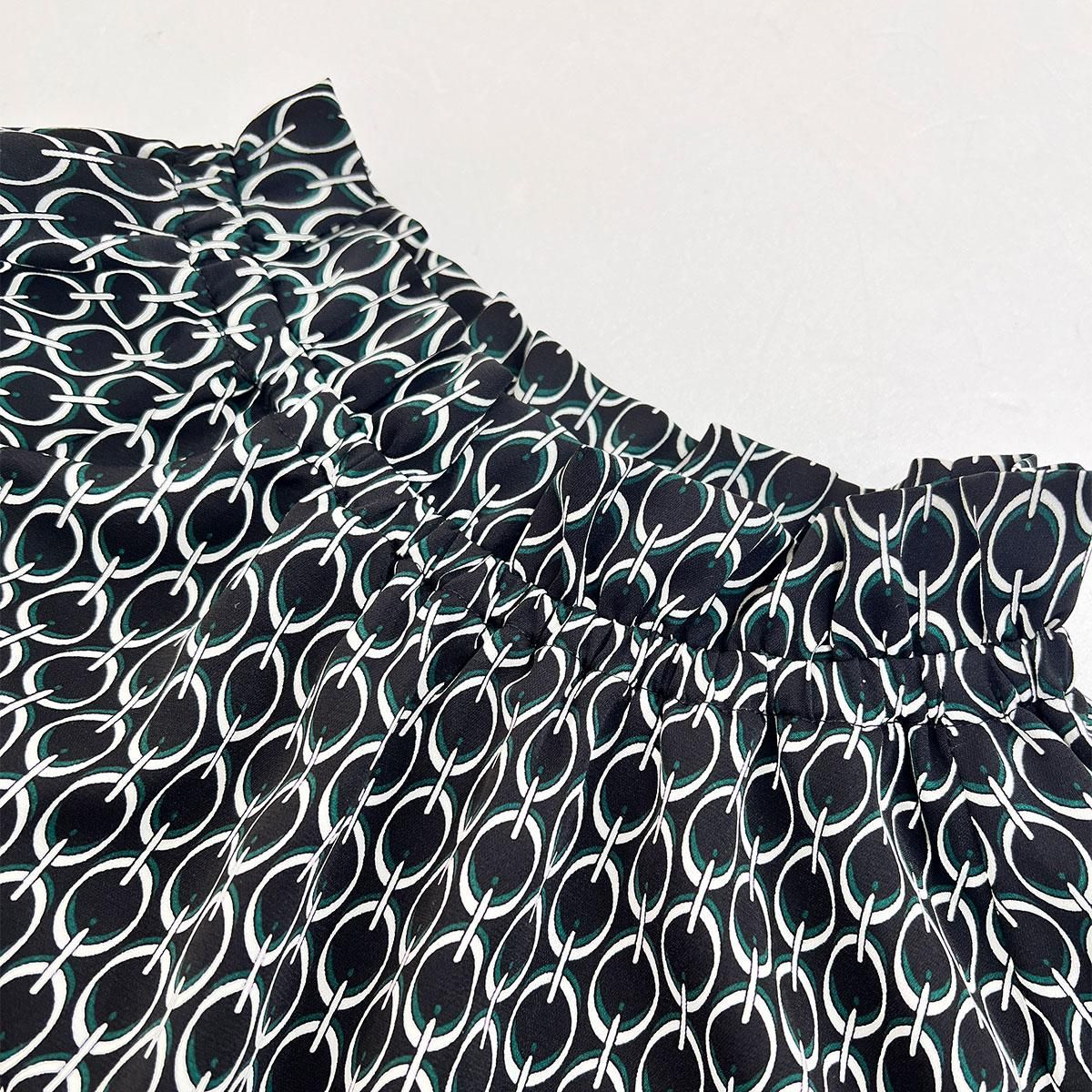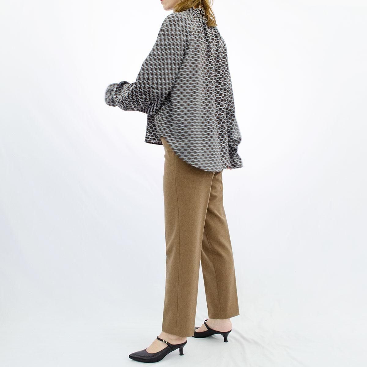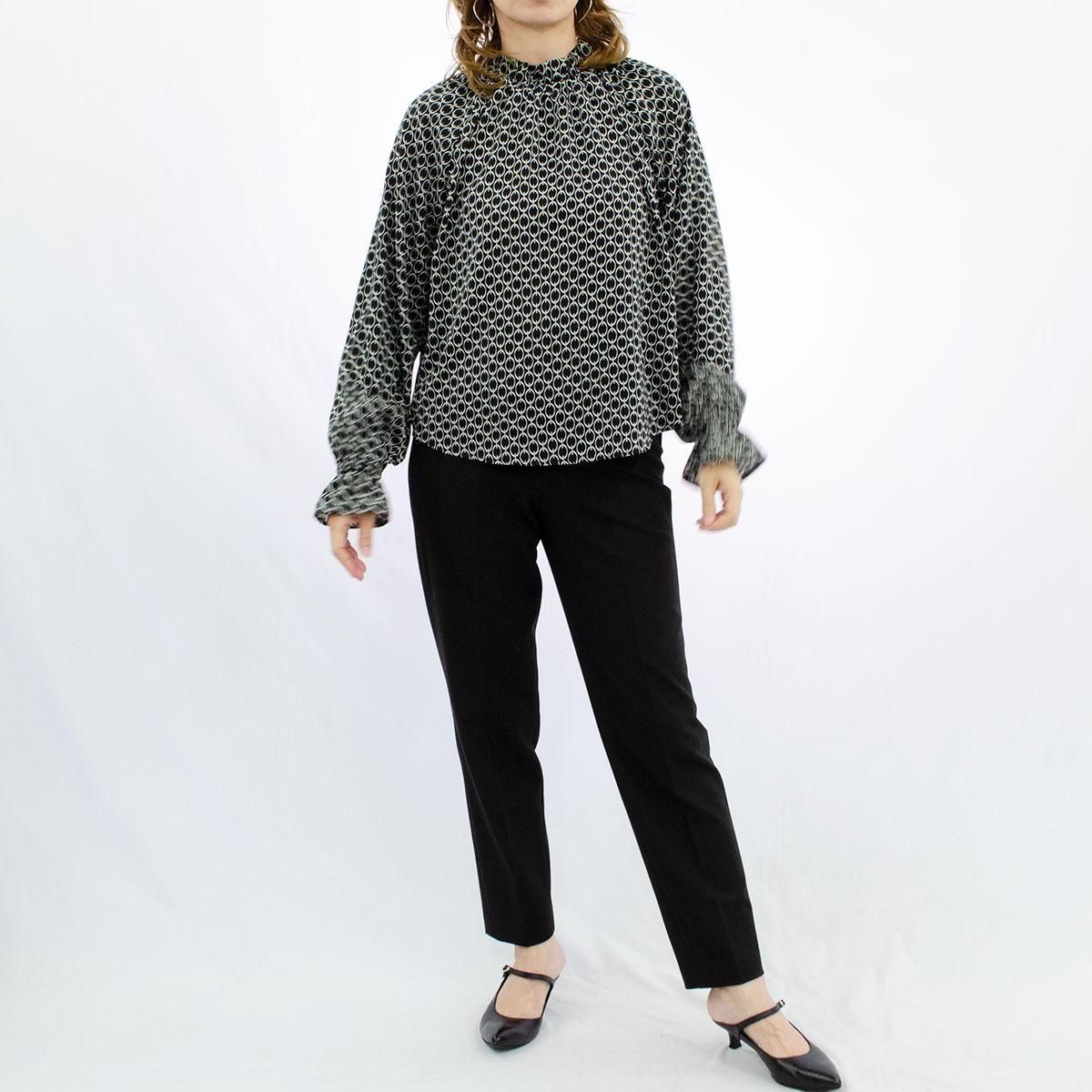 レトロプリント・スタンドカラー・ベルスリーブブラウス