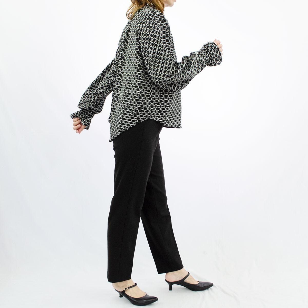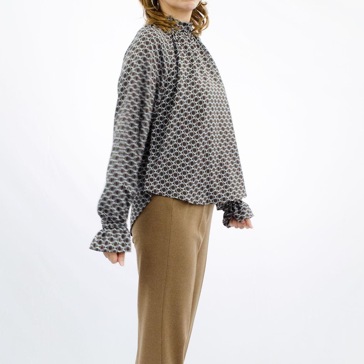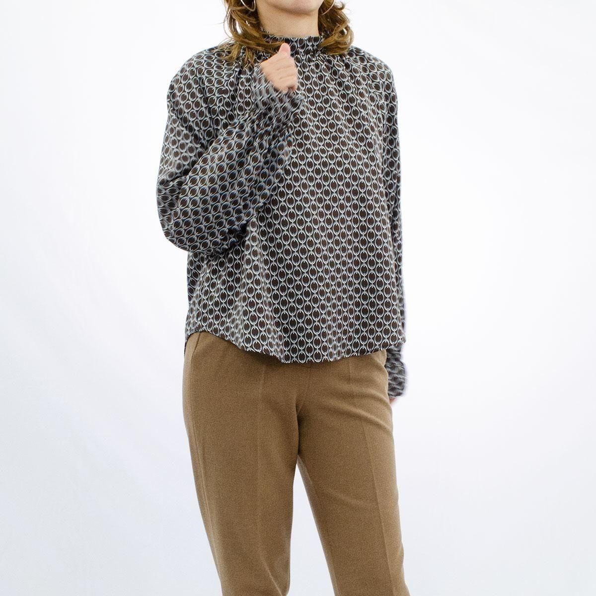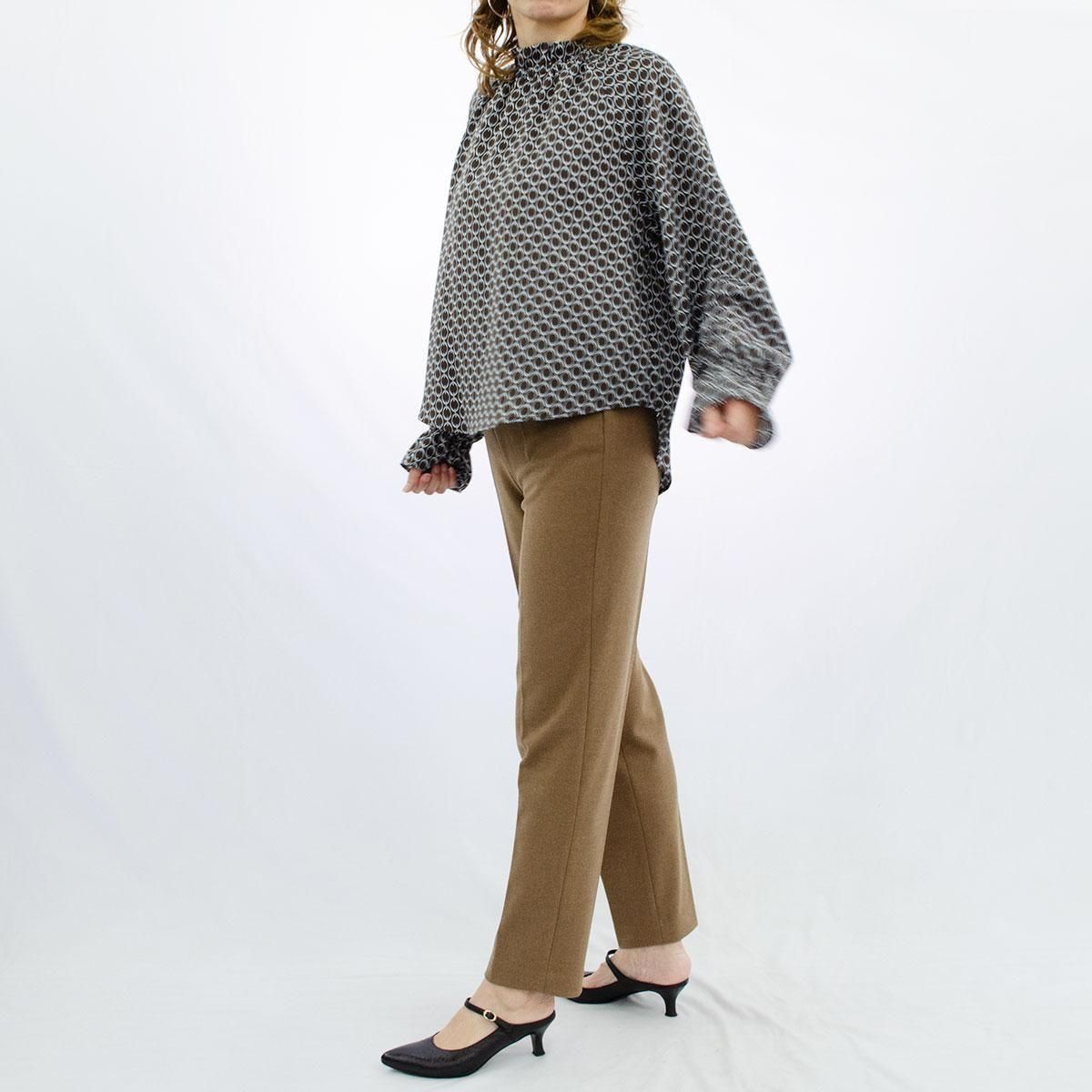 レトロプリント・スタンドカラー・ベルスリーブブラウス