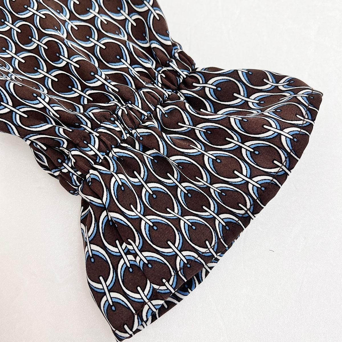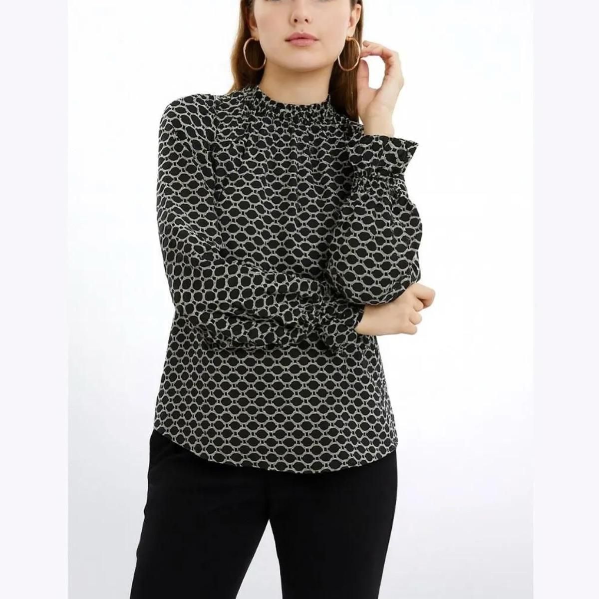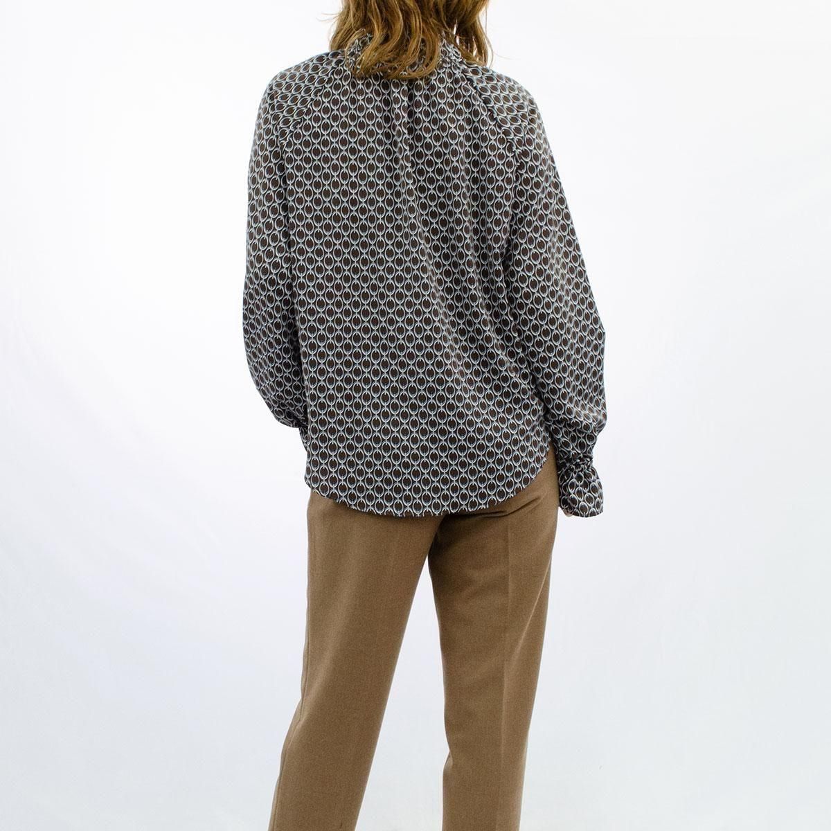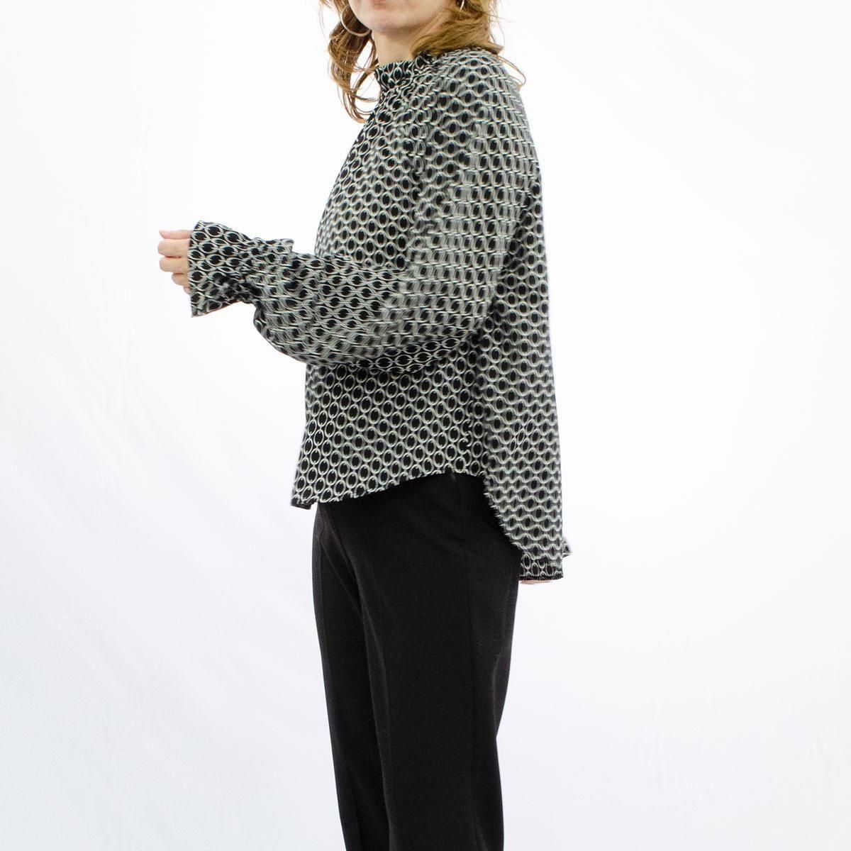 レトロプリント・スタンドカラー・ベルスリーブブラウス