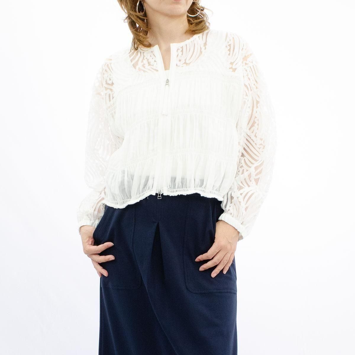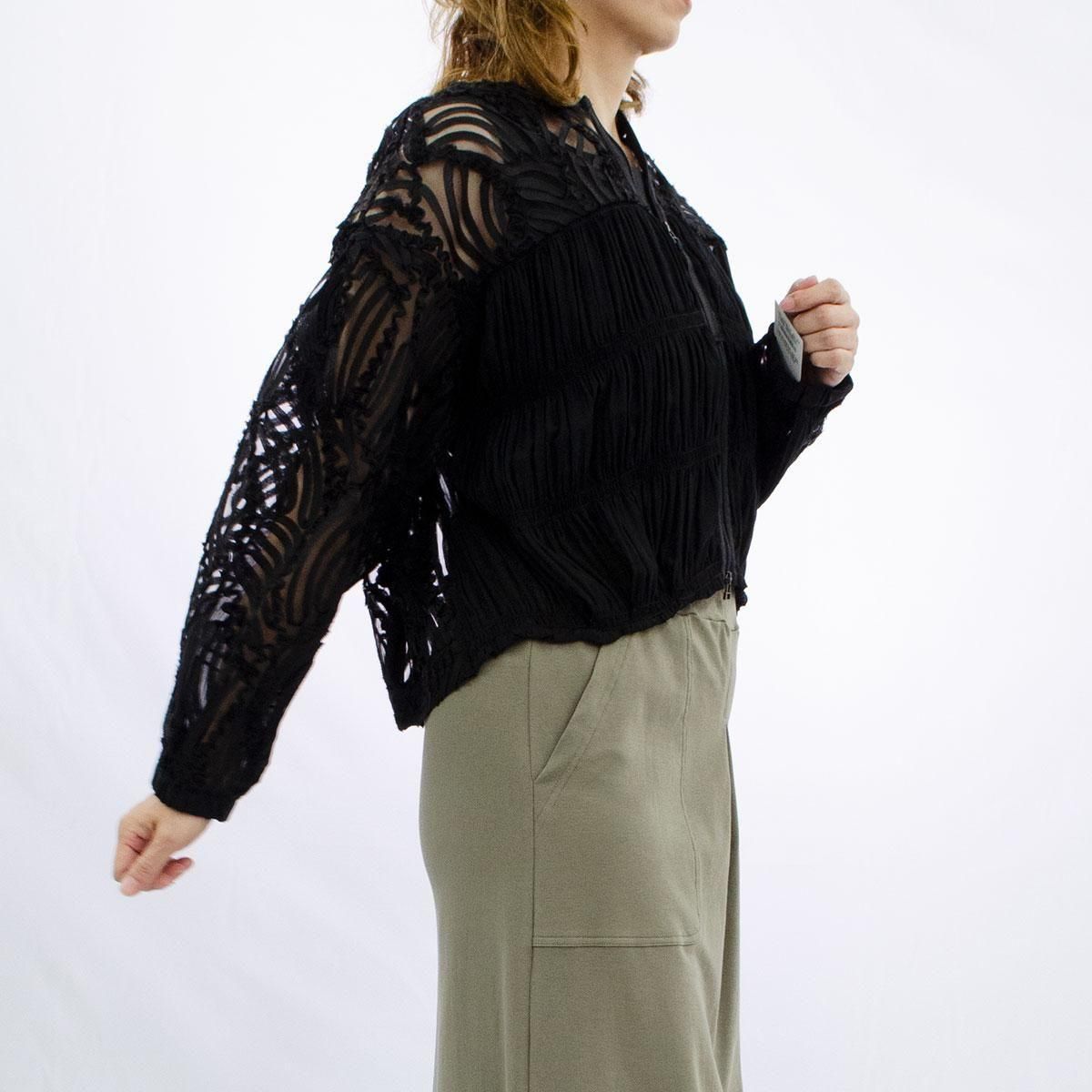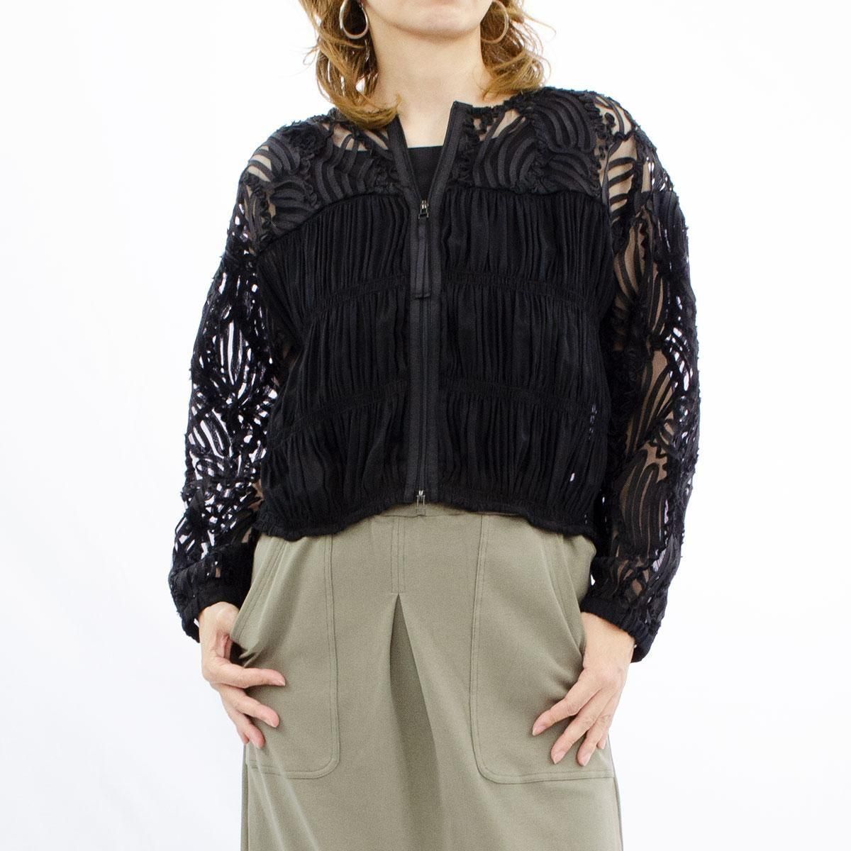 繊細なレースとギャザーが目を引く、シースルー素材のブルゾン。