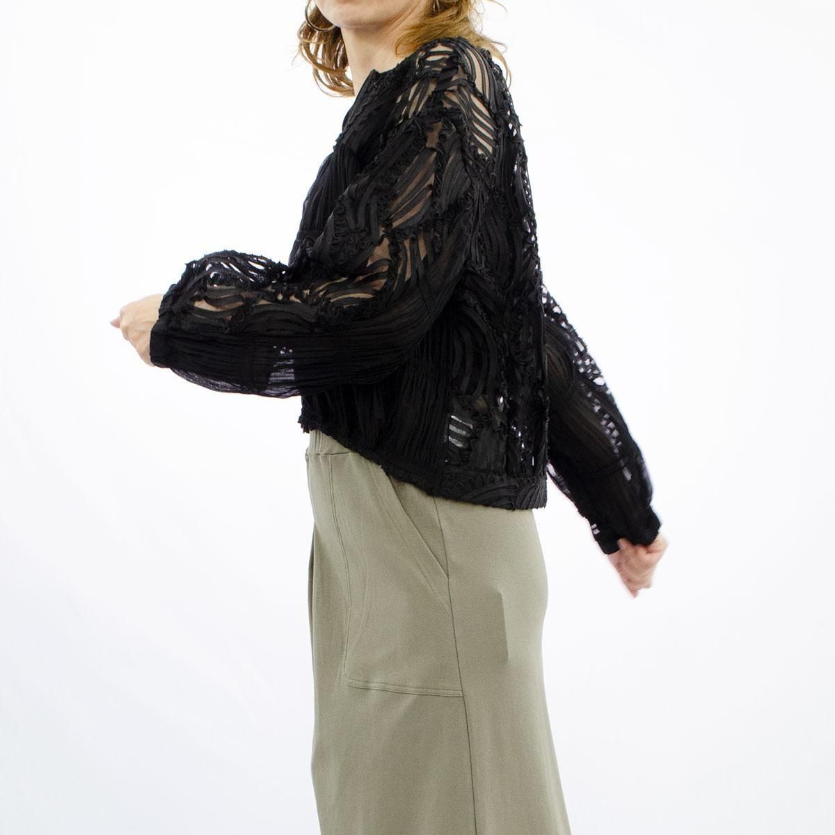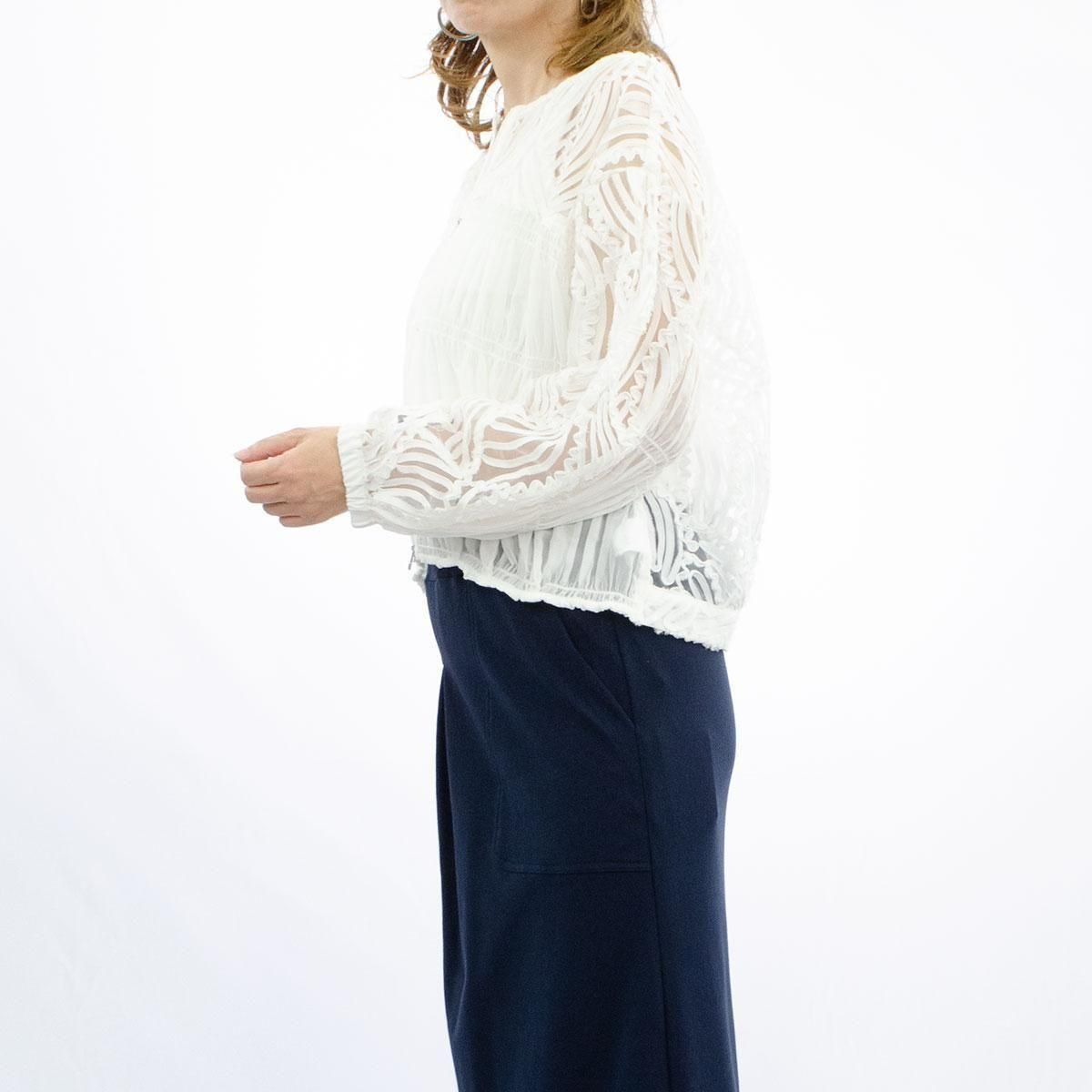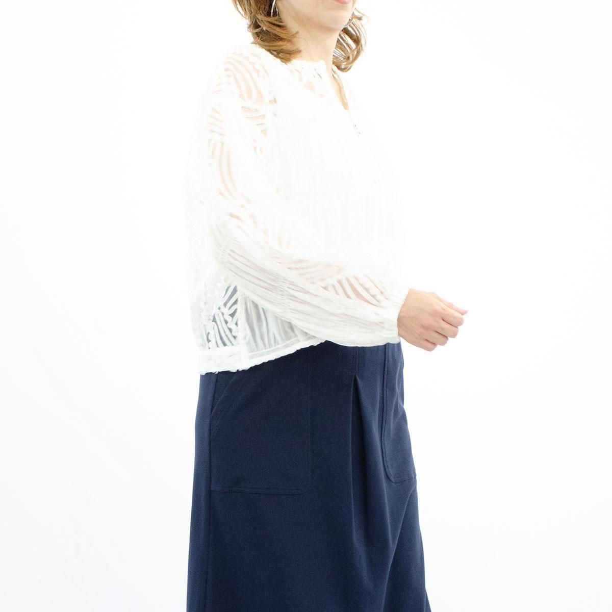 繊細なレースとギャザーが目を引く、シースルー素材のブルゾン。