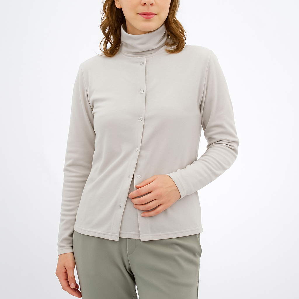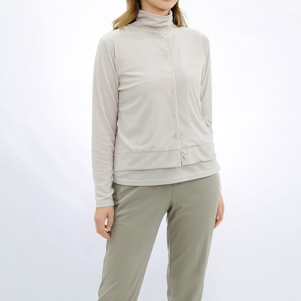首元に優しく沿うようなクールネックデザインで、すっきりとした印象を与えます。