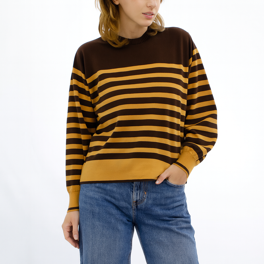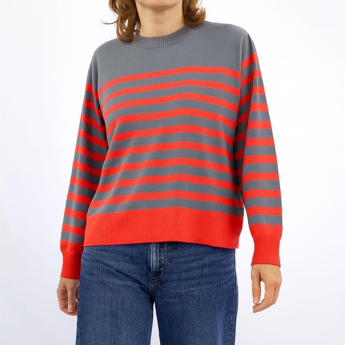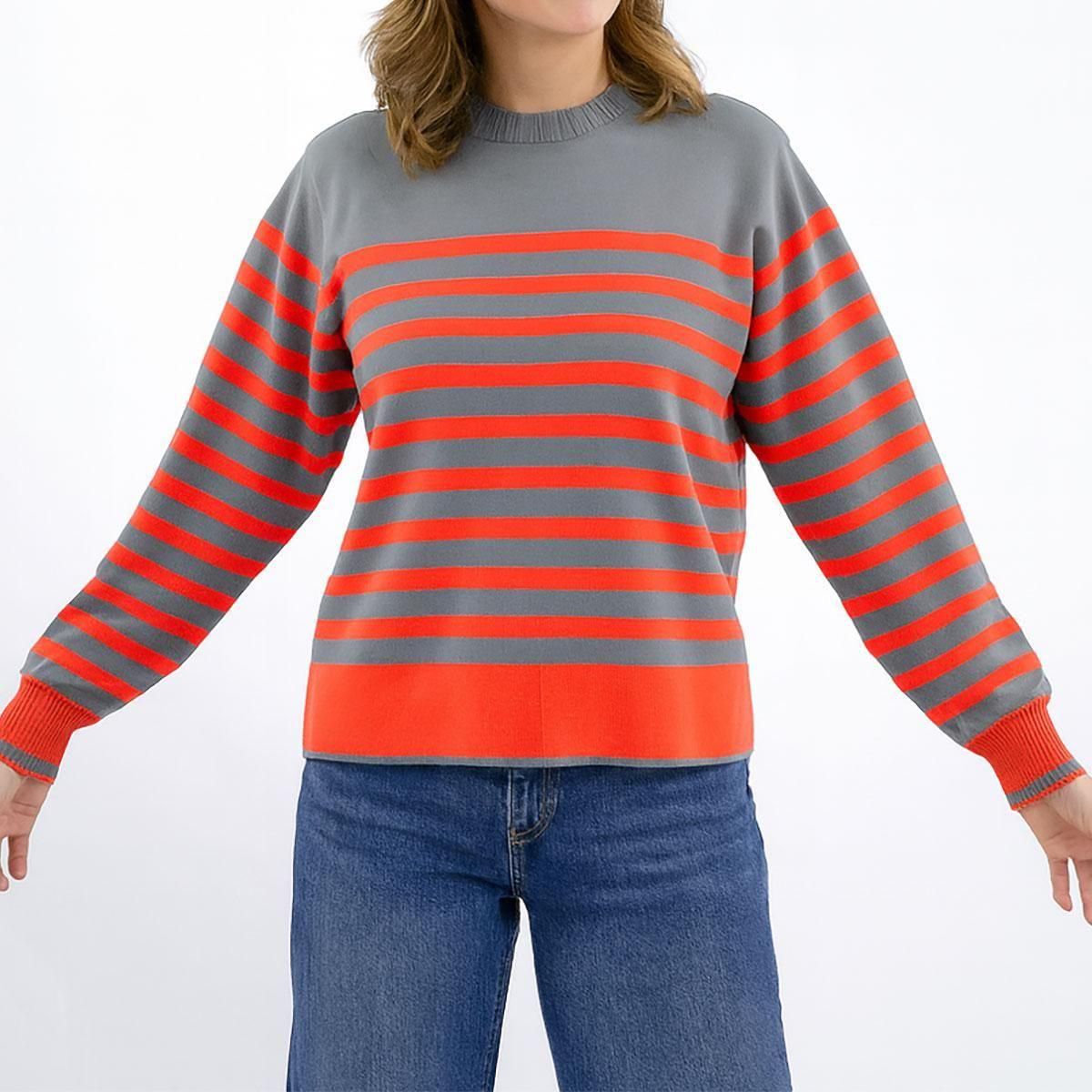 大胆な配色ボーダーが目を引く、存在感のあるニットです。