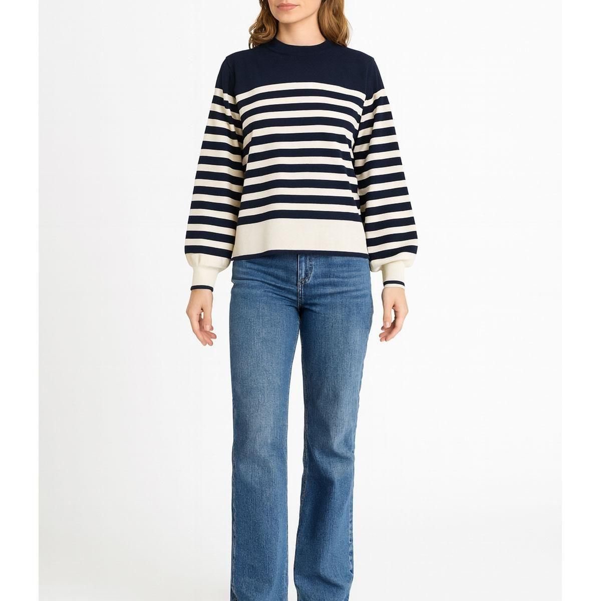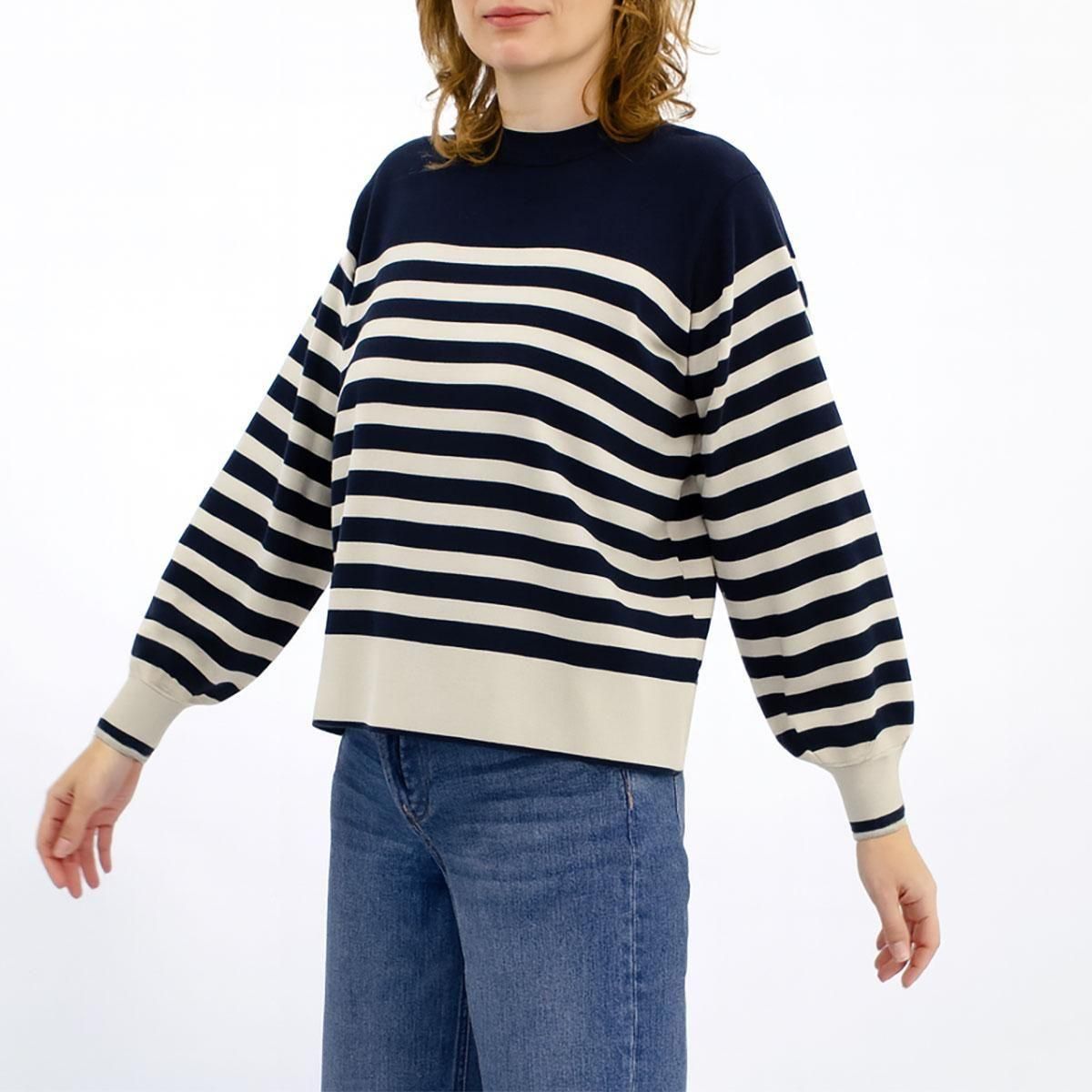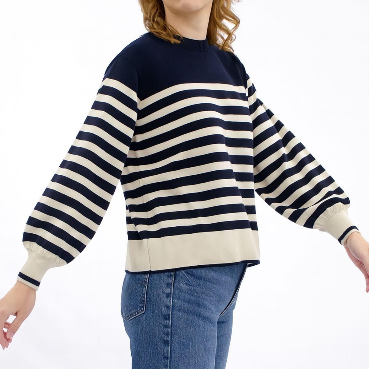 袖のふんわりとしたシルエットから、手首にかけては幅広のリブ編みでキュッと絞られ、メリハリのあるデザインになっています。