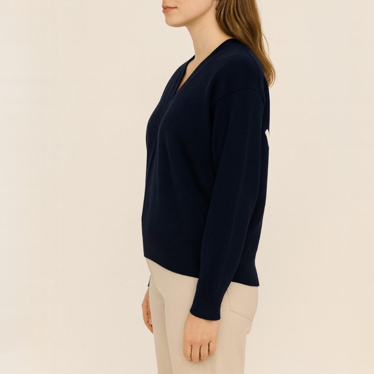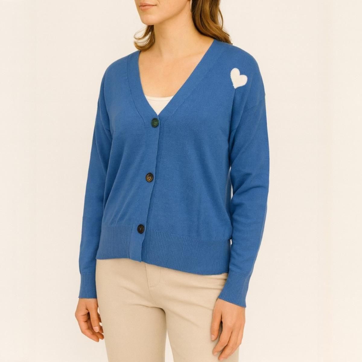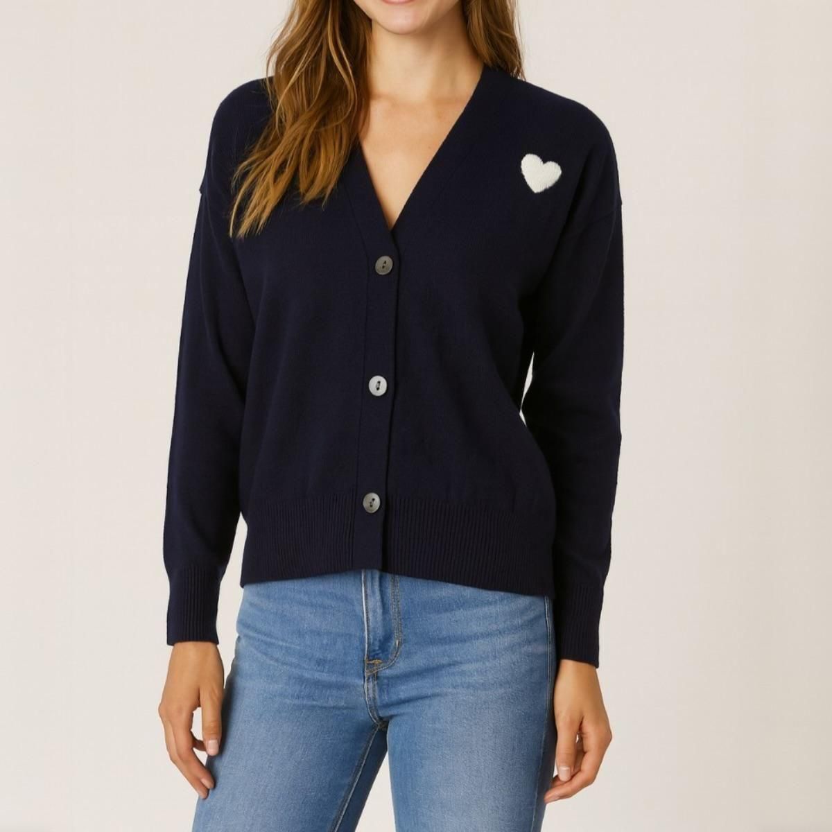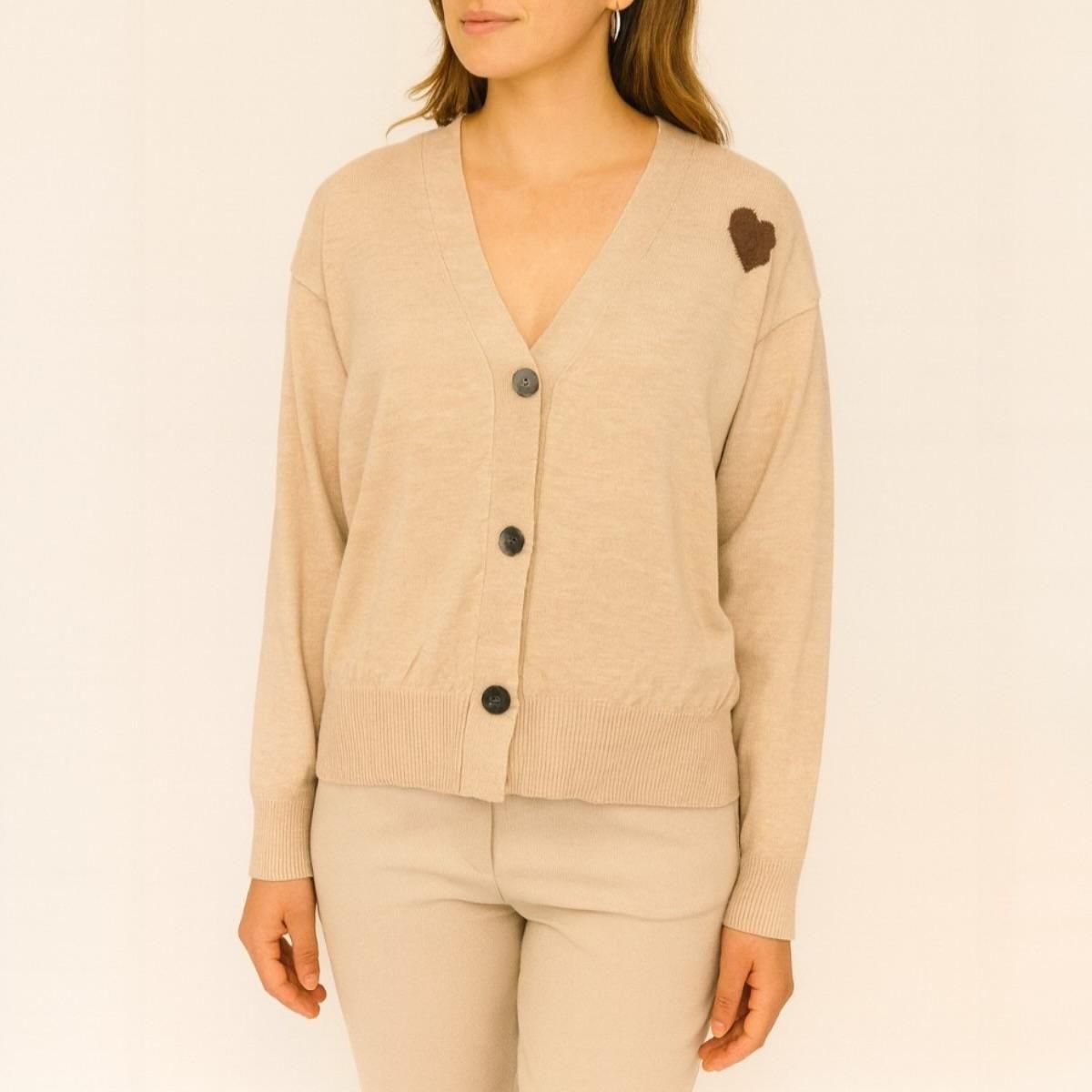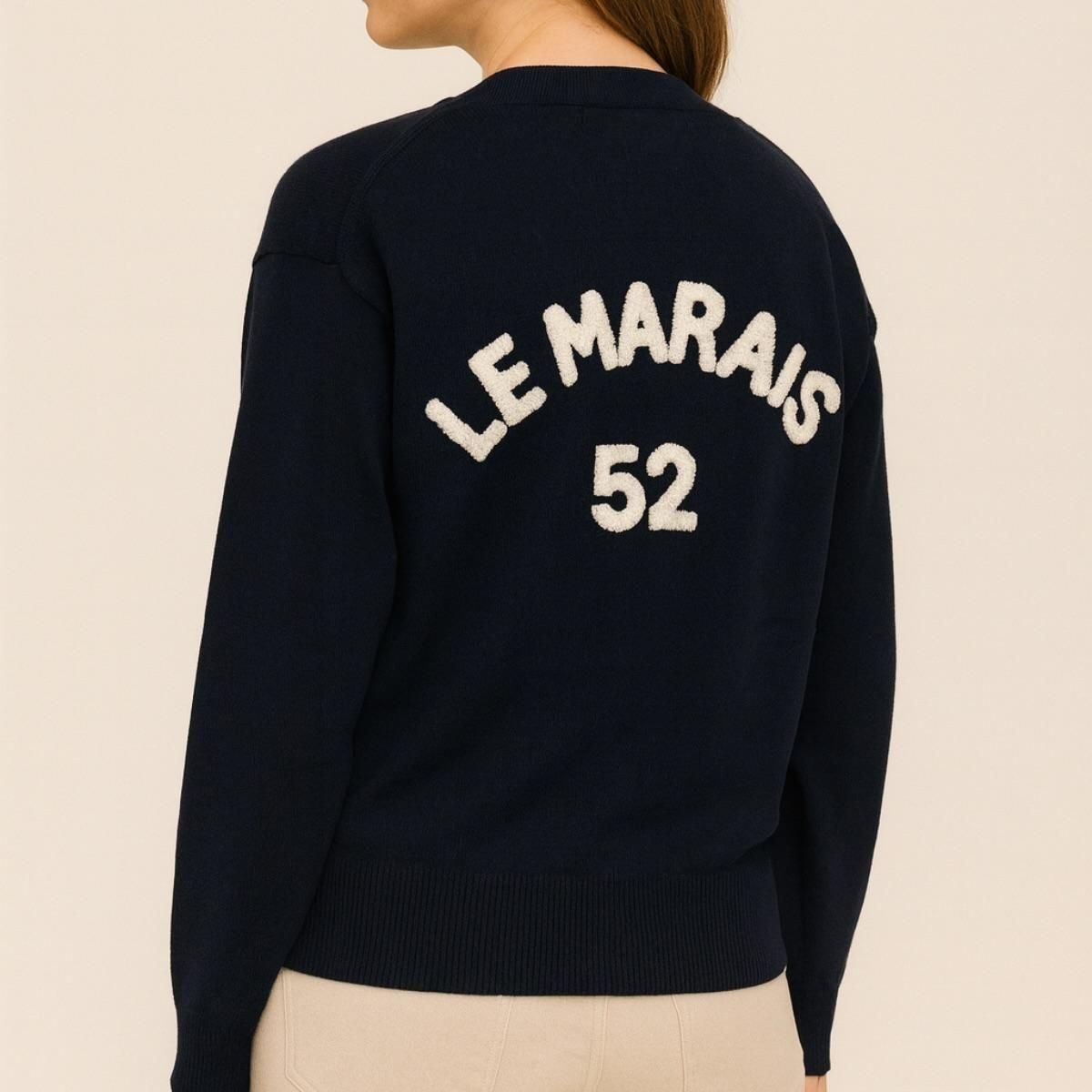 胸元のハートワンポイントと、背中の「LE MARAIS 52」ロゴが印象的な大人カジュアルなカーディガン。柔らかな素材のカーディガン。