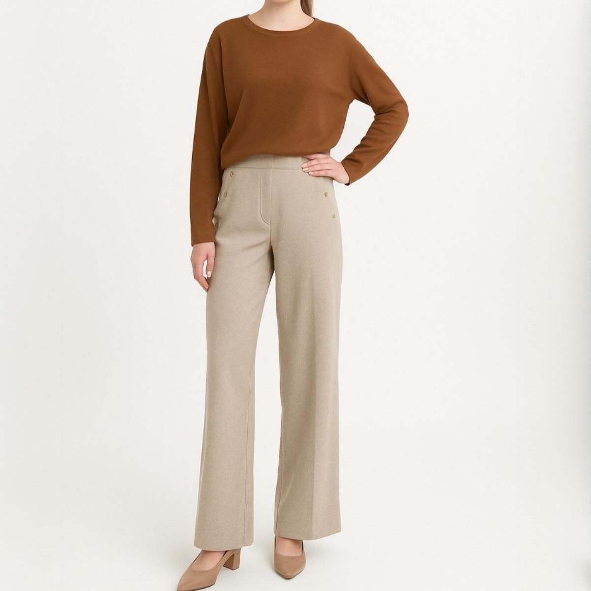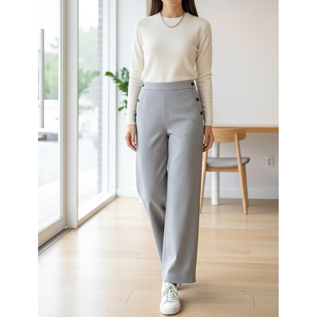 太めのベルトラインがウエスト周りをすっきりと見せ、裾に向かってストンと落ちるストレートなワイドシルエットが、体形をカバーしながら脚長効果を演出します。