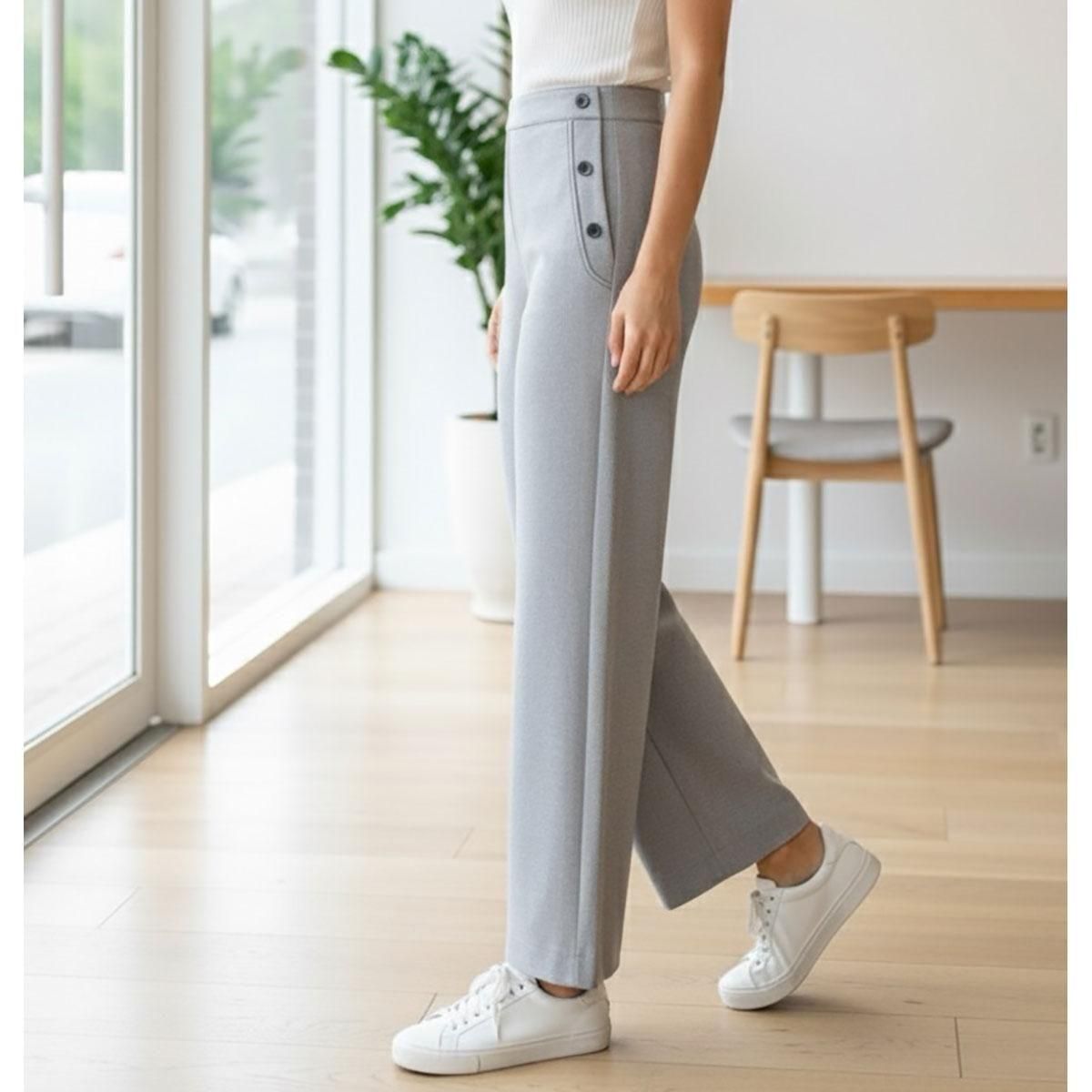 ストレッチ性があり、フロントはホックとファスナーで本格的な仕立てで、後ウエストはゴム仕様になっているため、正面はすっきりきれいめなのに、締め付け感のないストレスフリーな履き心地を実現しました。