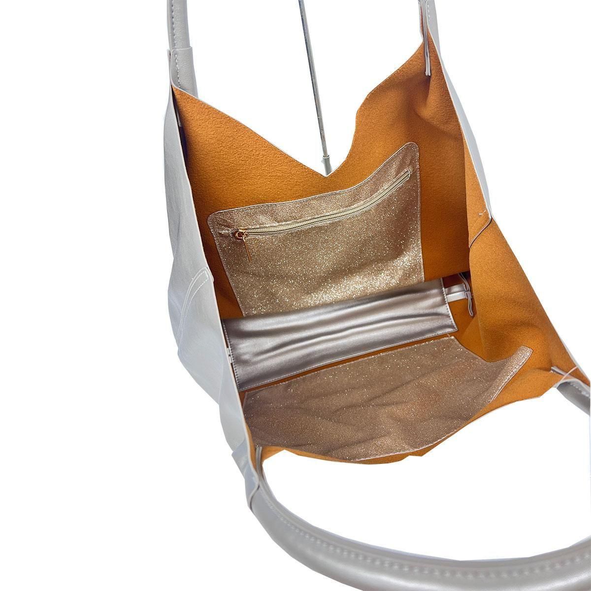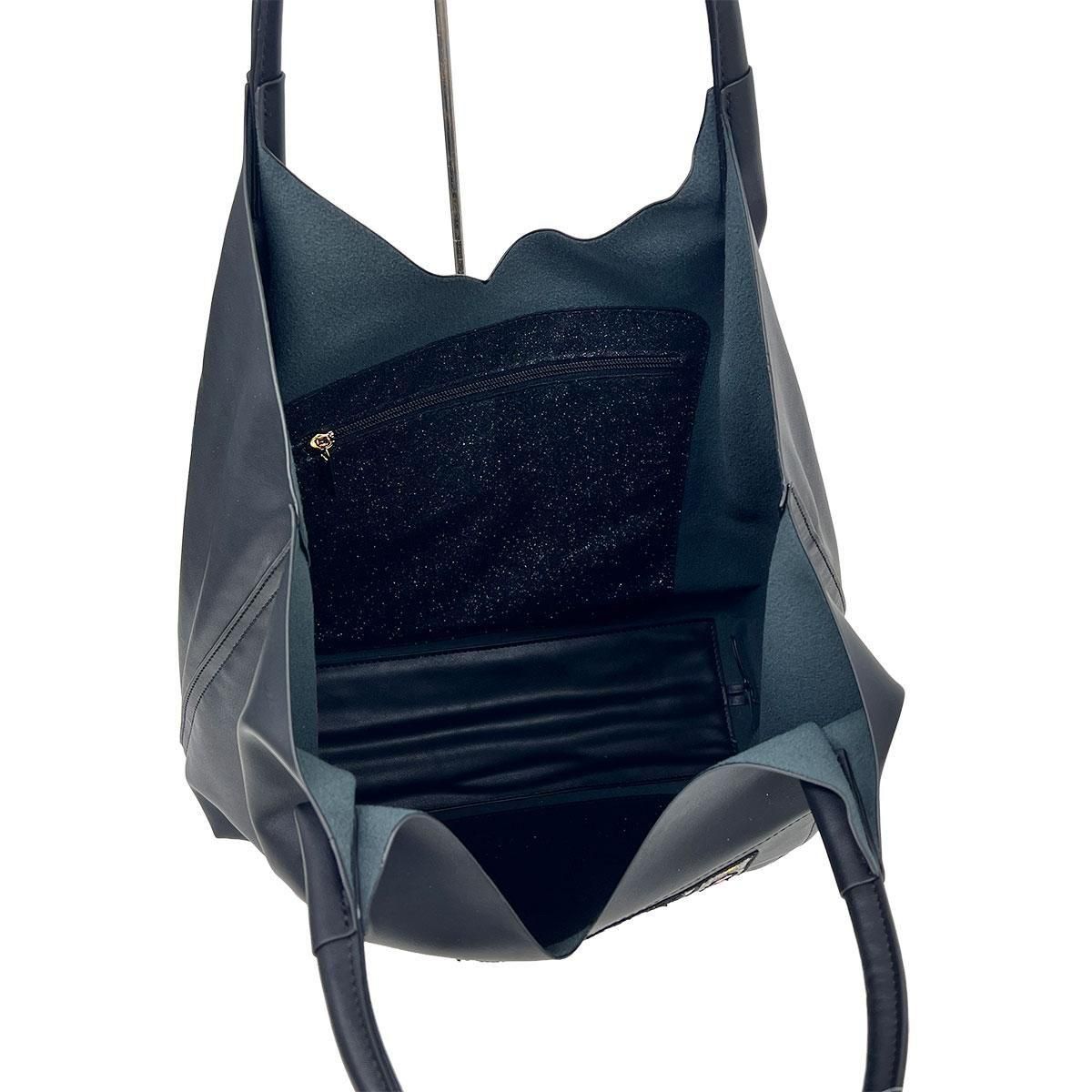 バッグの内側、側面にはラメ素材を使用し、片側にはファスナー付きポケットを完備。