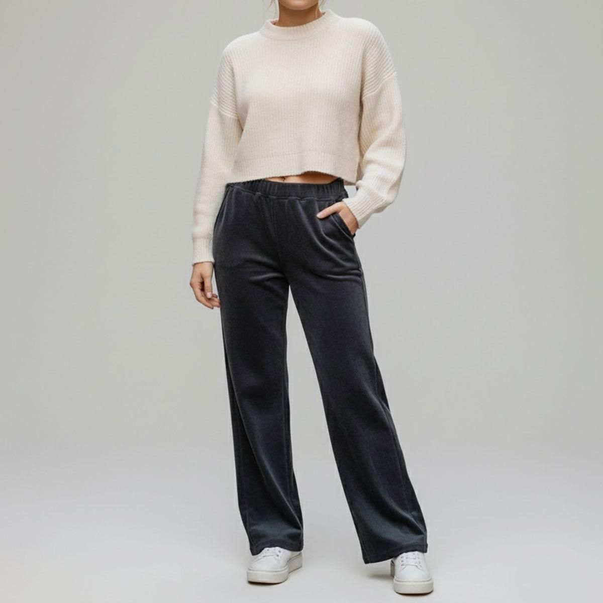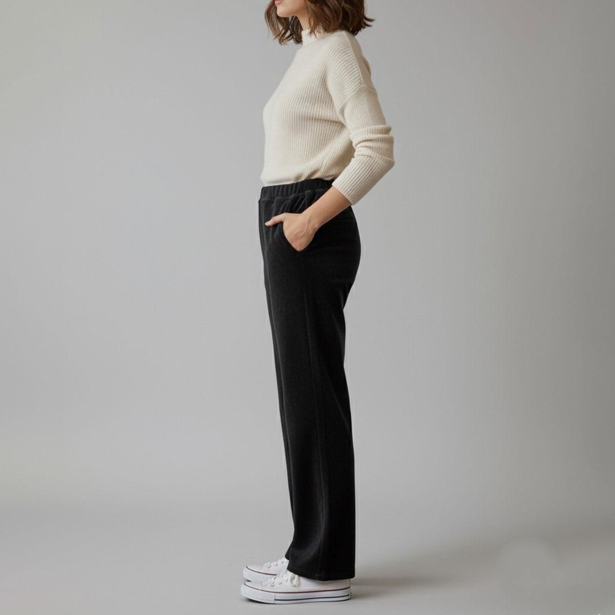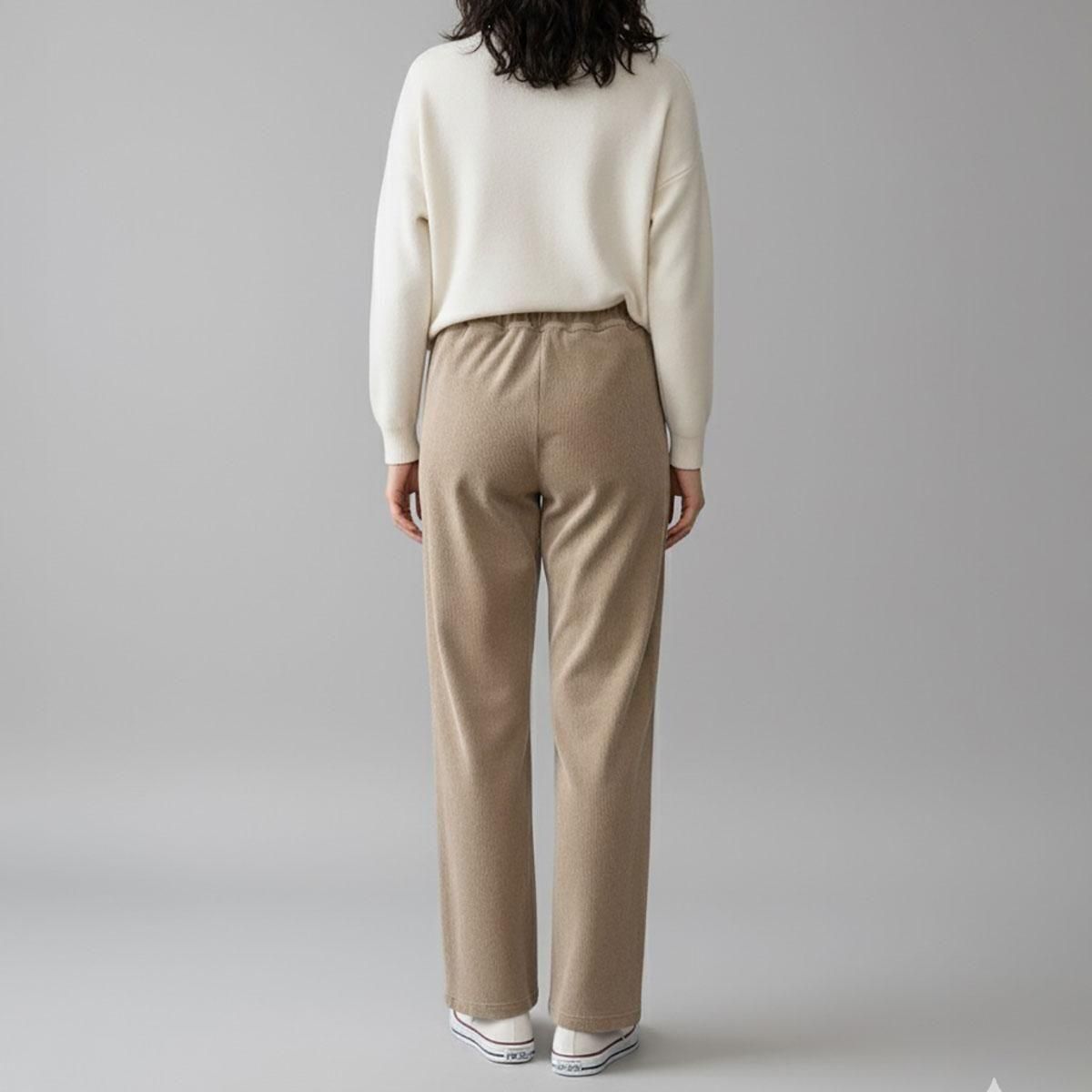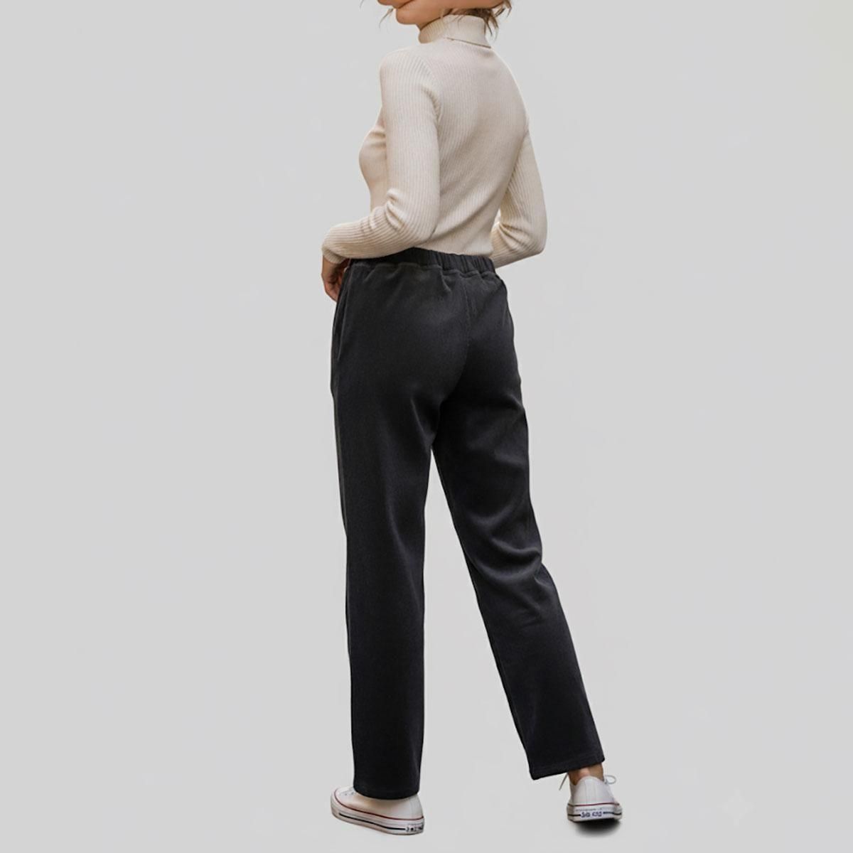 ストレートシルエットが、脚のラインを拾わず、すっきりとした印象を与えます。