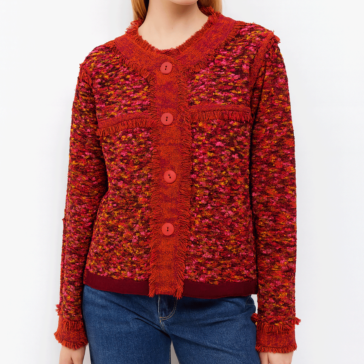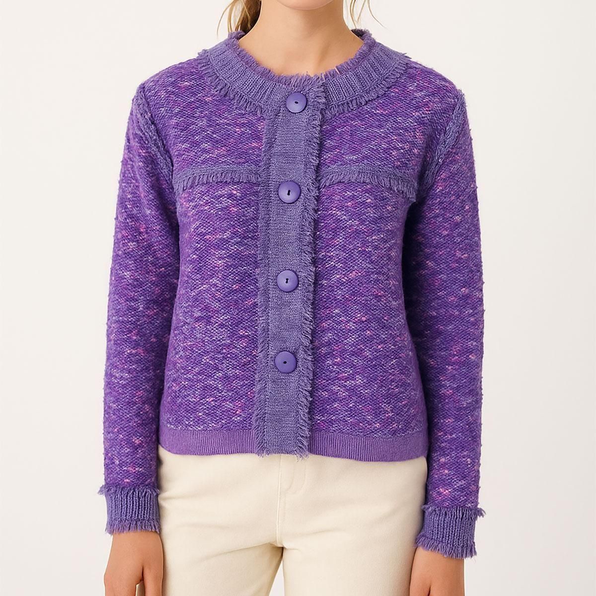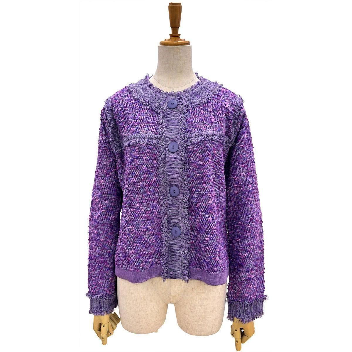 表情のあるミックス素材に、フロントと袖口と衿元のフリンジディテールがアクセントになった大人かわいいニットカーディガン。