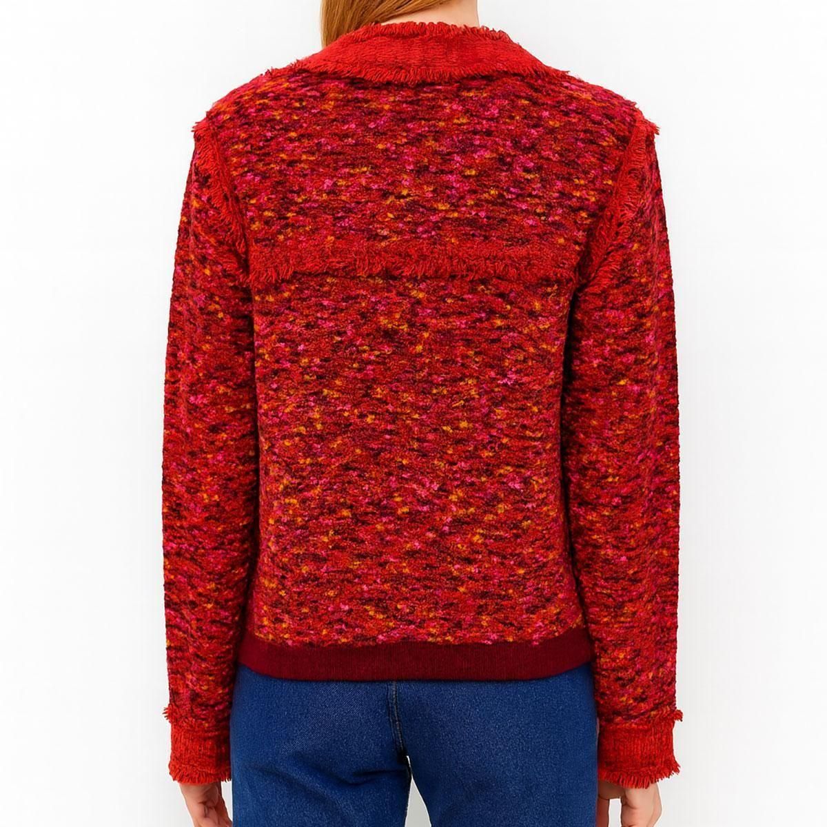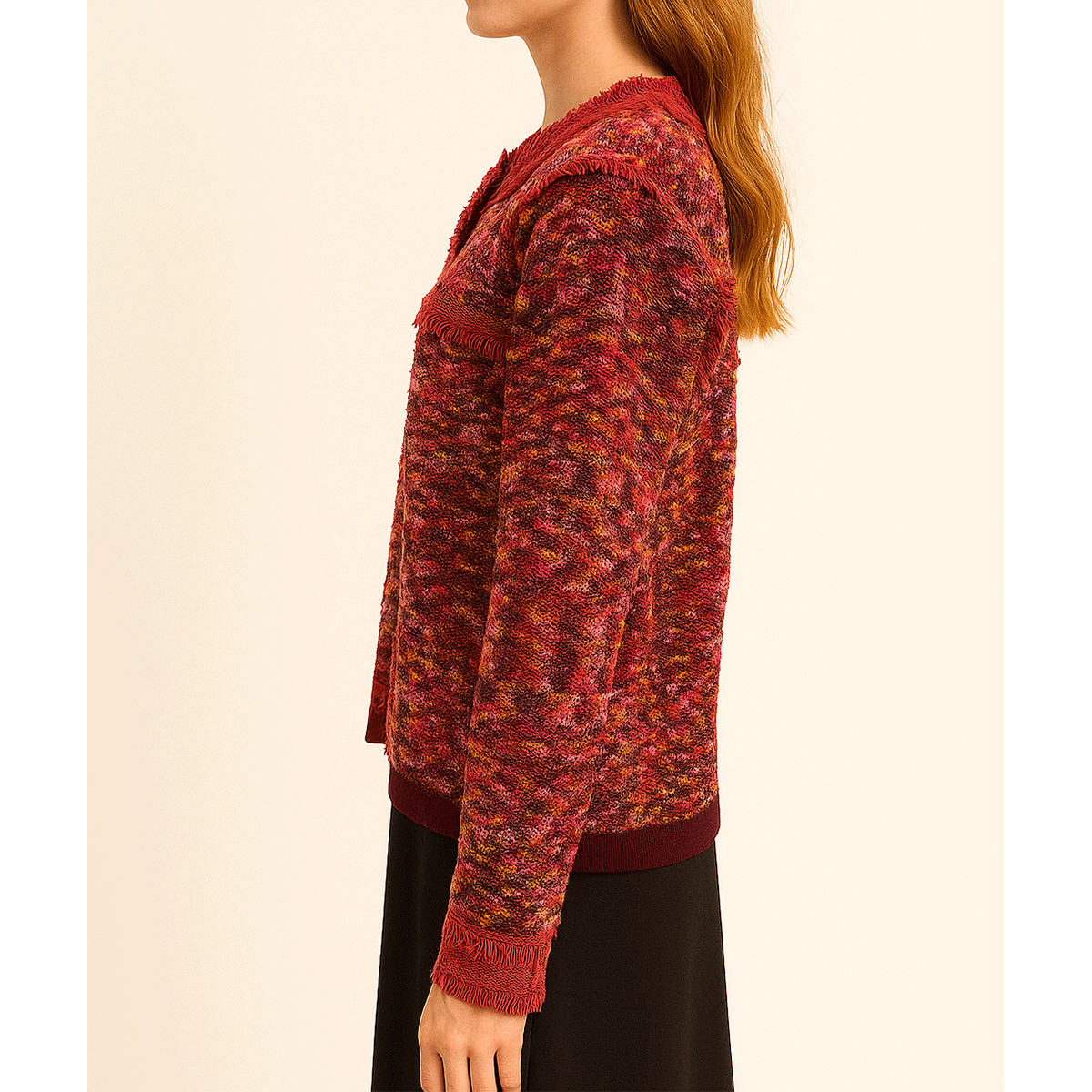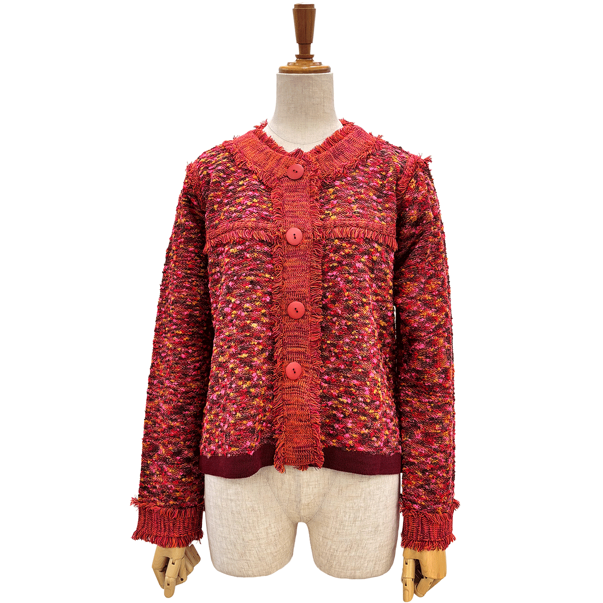 表情のあるミックス素材に、フロントと袖口と衿元のフリンジディテールがアクセントになった大人かわいいニットカーディガン。
