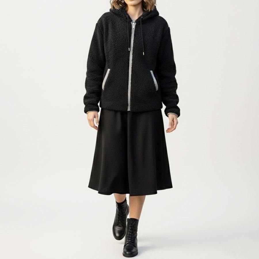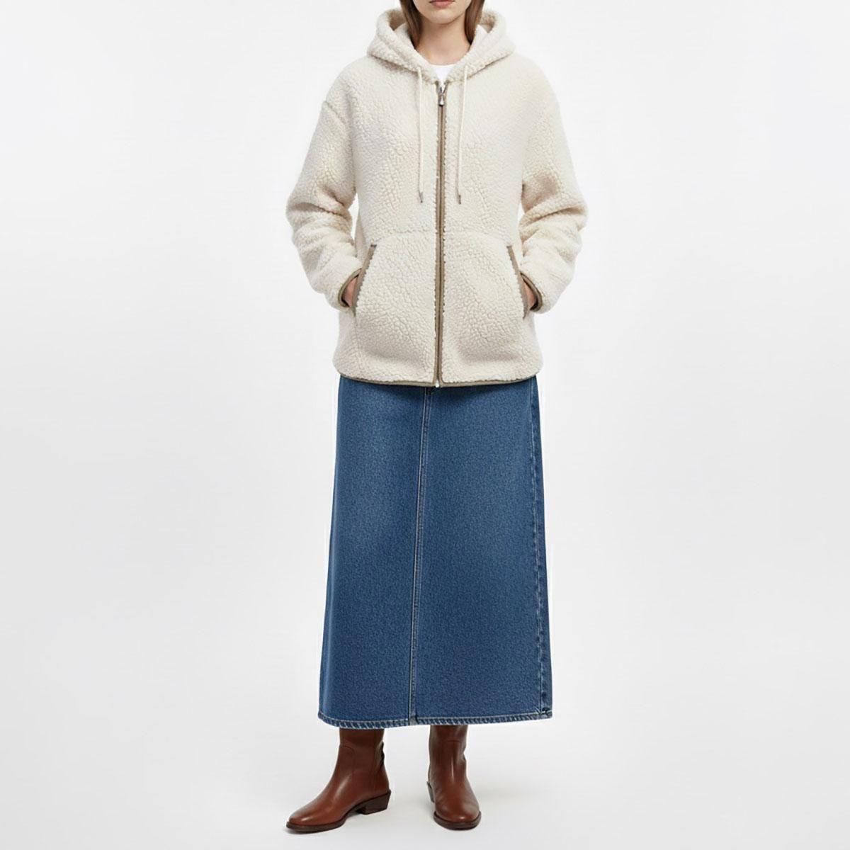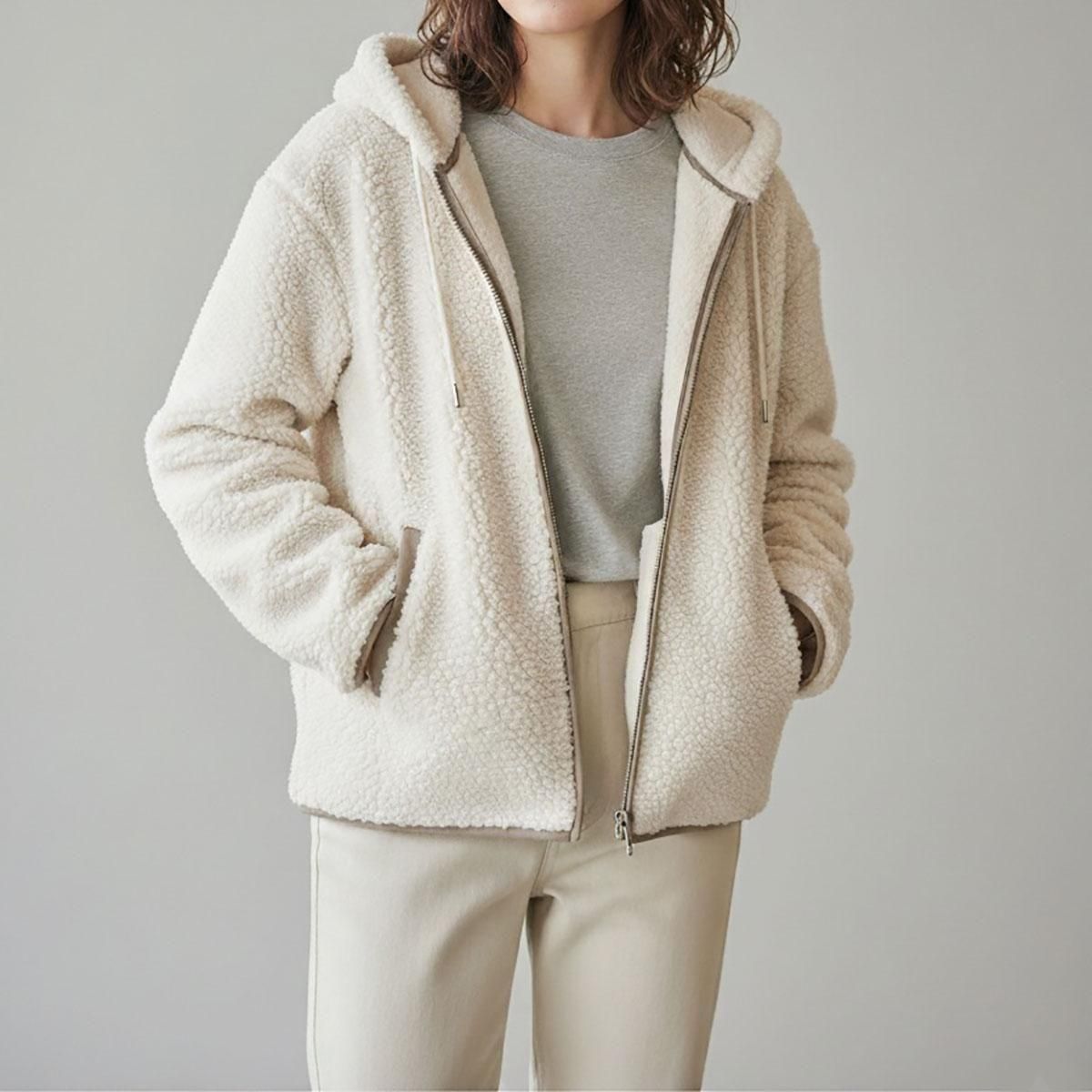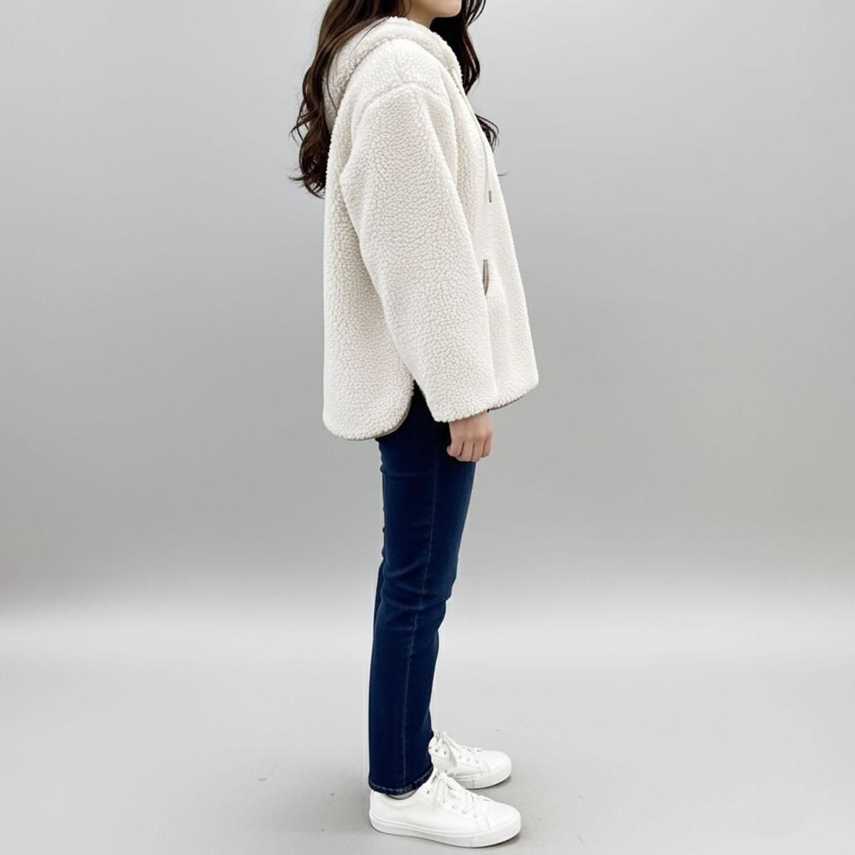 着脱しやすいフルジップアップ仕様で、フードがあり、ドローコードが付いているため首元までしっかり暖かさを保つことができます。