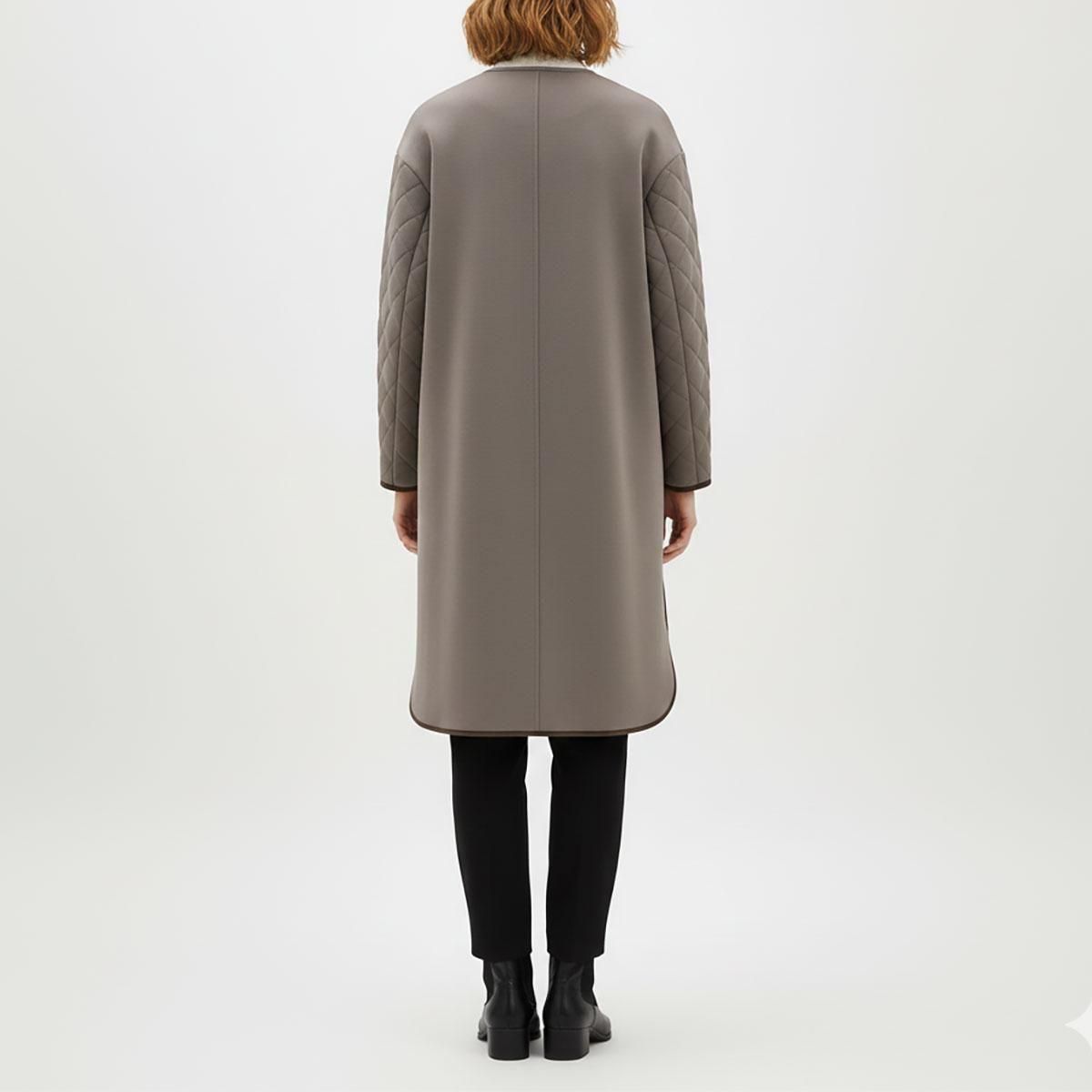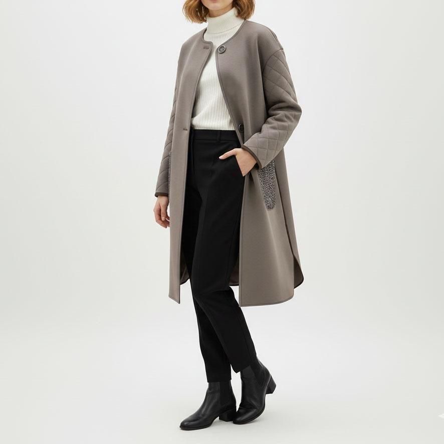異素材ミックスが目を惹く、大人のためのノーカラーコート。